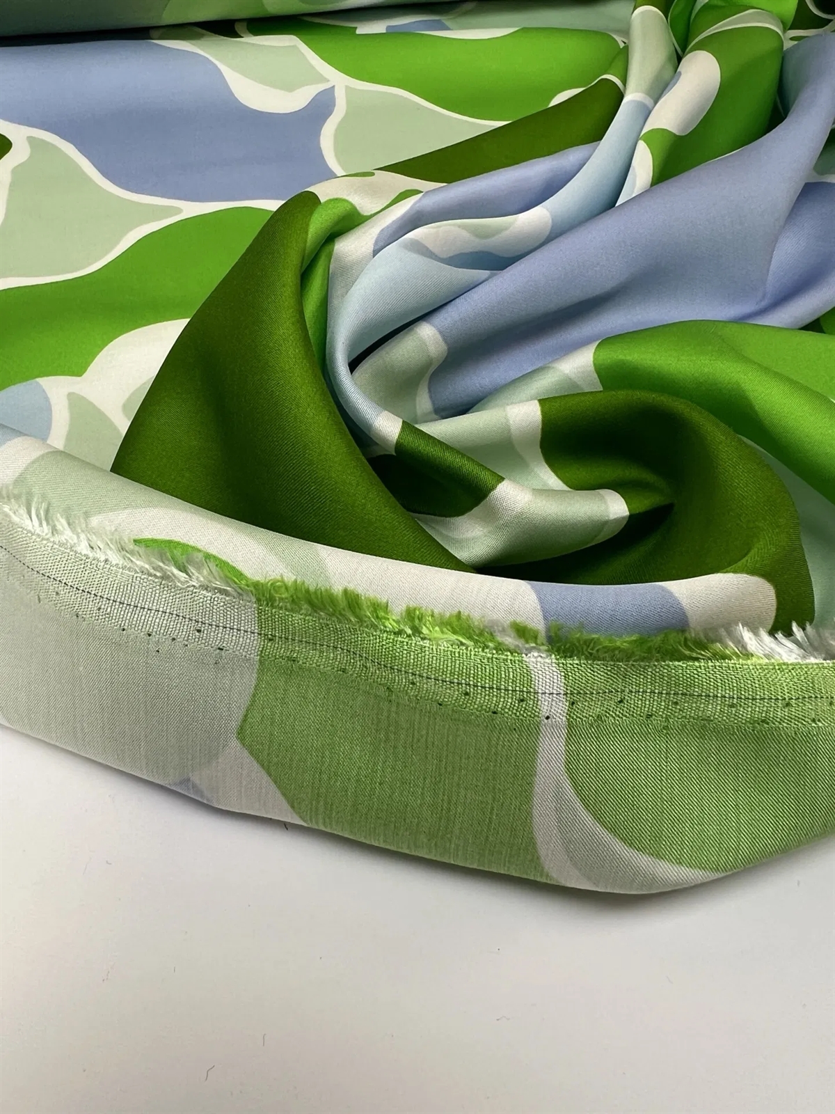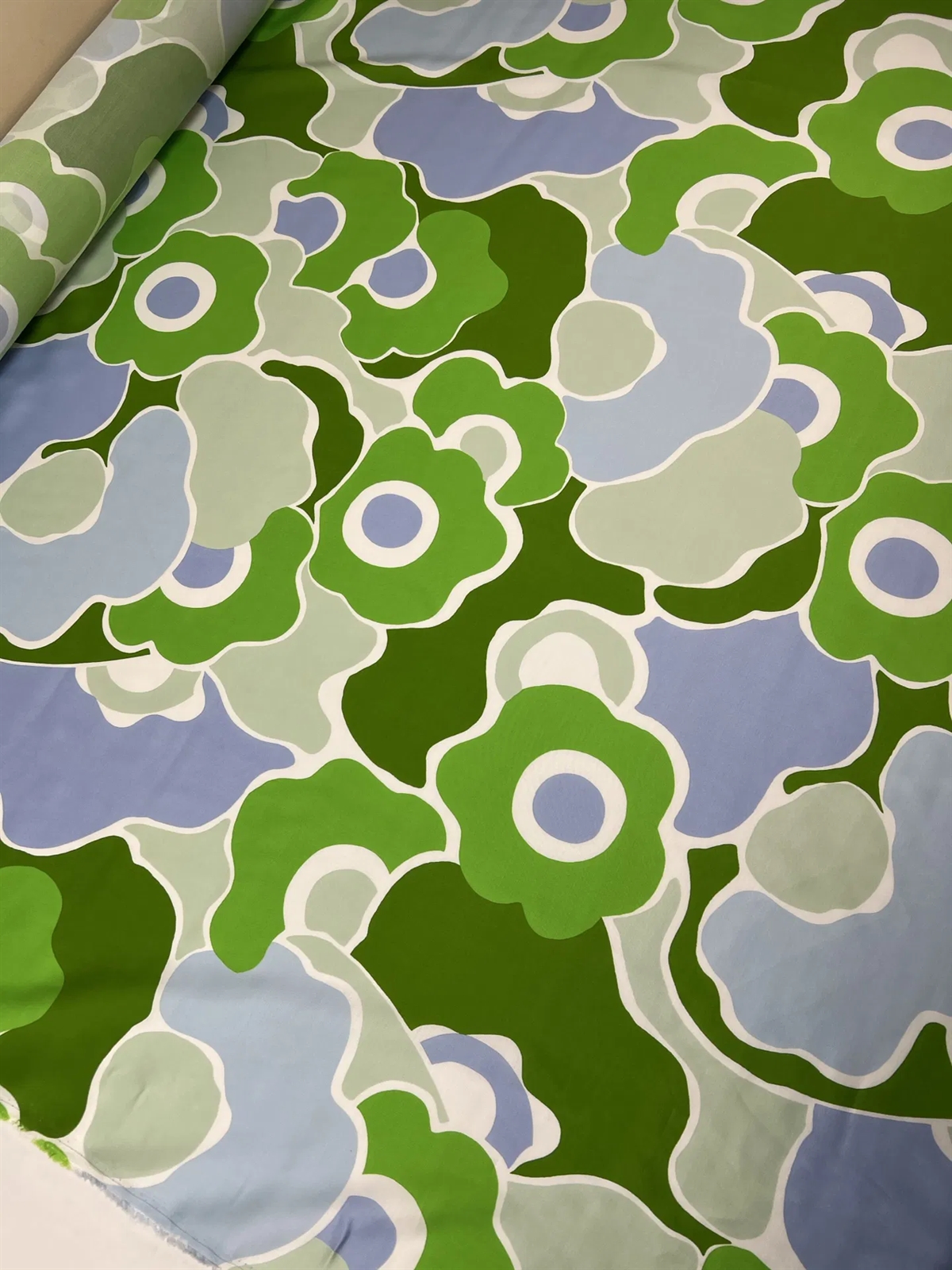 Satinvævet viscose med Marimekko lignende blomsterprint i grønne nuancer. Kvaliteten er medium kraftig, glat og let sprød.