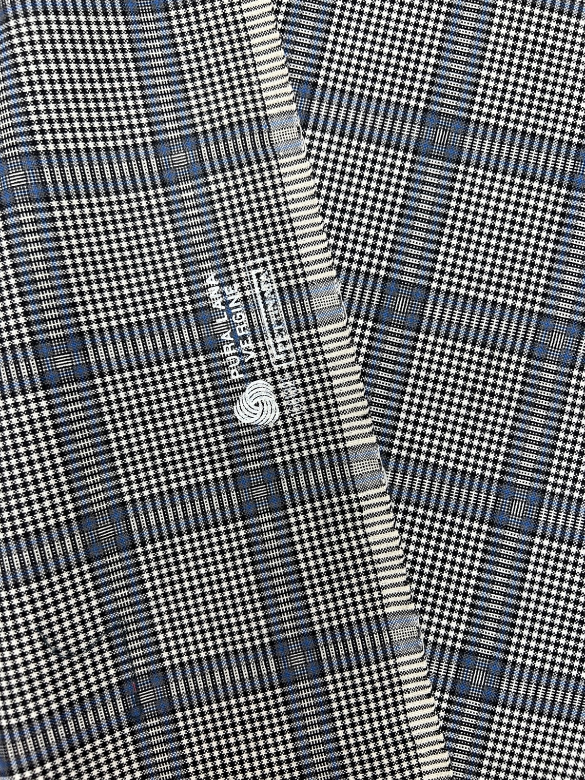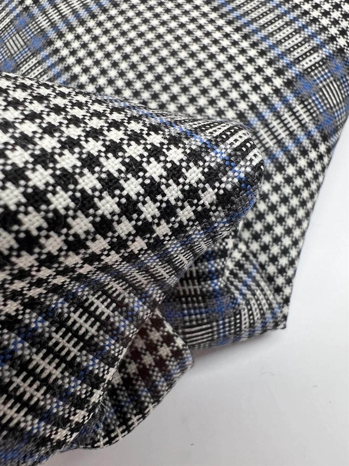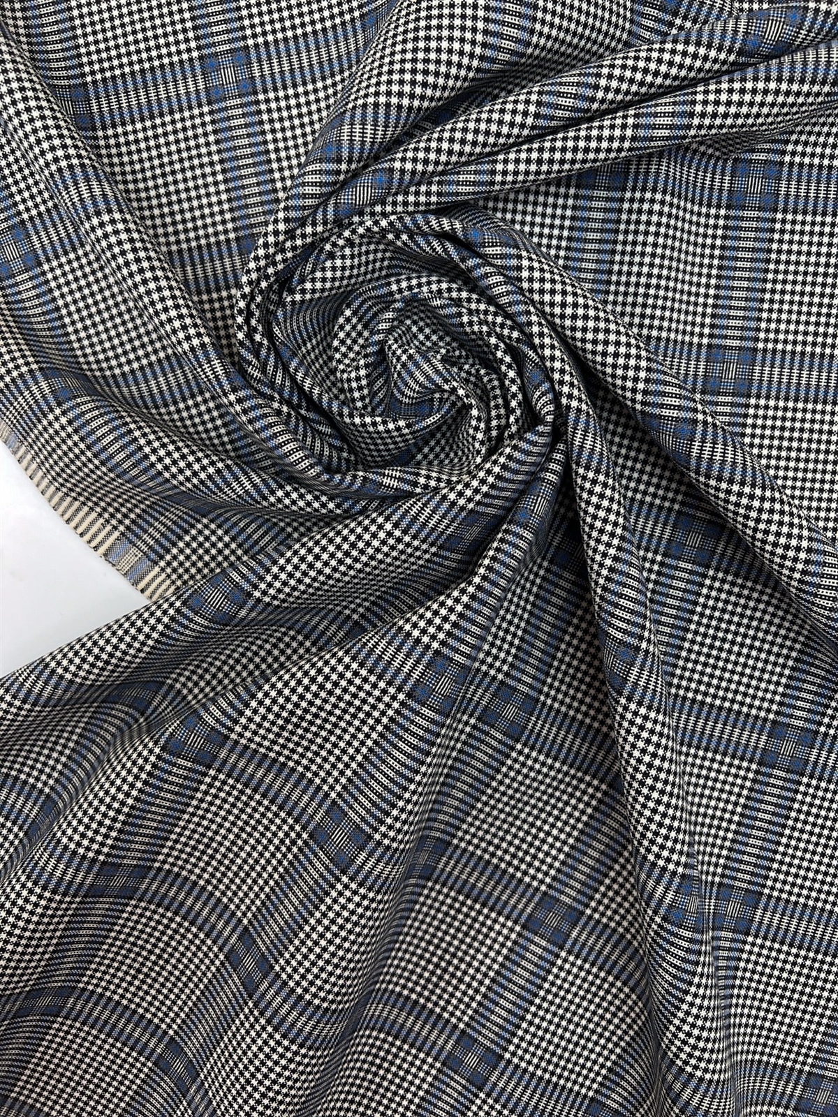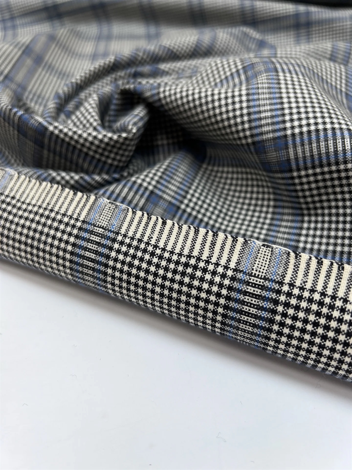 Dette smukke stof er vævet i 100% ren uld af højeste kvalitet og har et klassisk ternet mønster i sort, hvid og blå nuancer. Kombinationen af de skarpe kontraster og den elegante blå detalje giver stoffet et moderne og herreinspireret udtryk. Stoffet er slidstærkt, åndbart og behageligt at have på, hvilket gør det ideelt til skræddersyede bukser, blazere, nederdele eller kjoler.