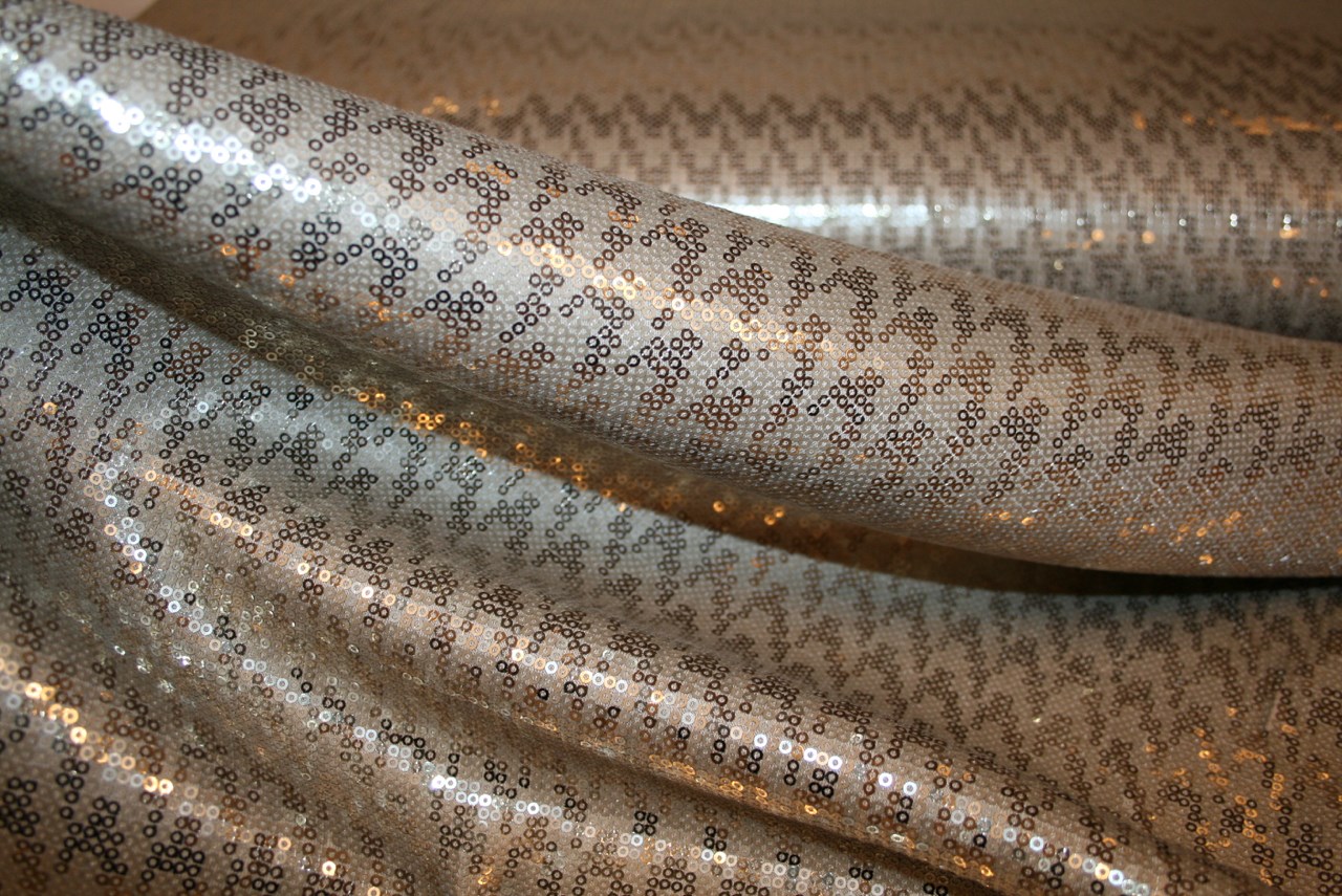 Viscose jersey med guld-pailletter. Pailletterne skifter mellem blank og mat overflade og skaber et zig-zag lignende mønster.