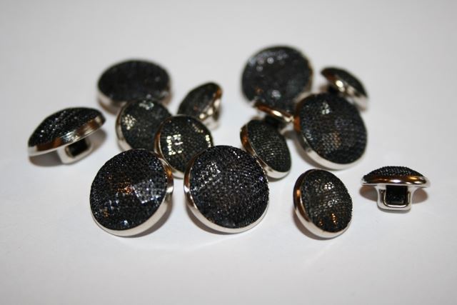 Smuk sort øjeknap med sølvgitter. Knappen måler 15 mm.