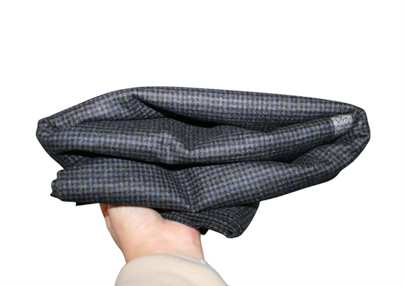 Fastvævet uld med små grå/sort/blå tern. Kvaliteten er let-medium kraftig. Brug fx stoffet til en kjole, nederdel eller bukser.