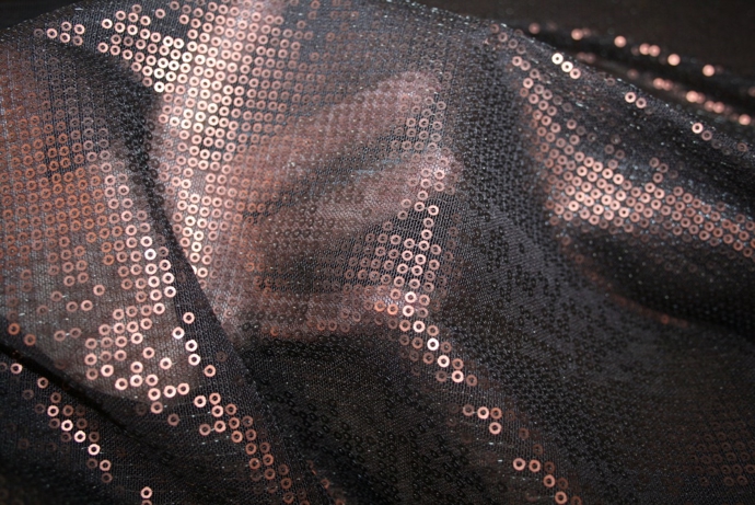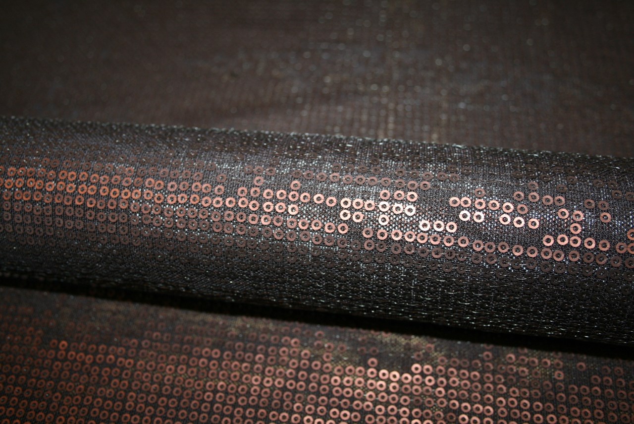 Små pallietter i kobberfarve monteret på en brun tylbund. Stoffet er elastisk i længderetningen.