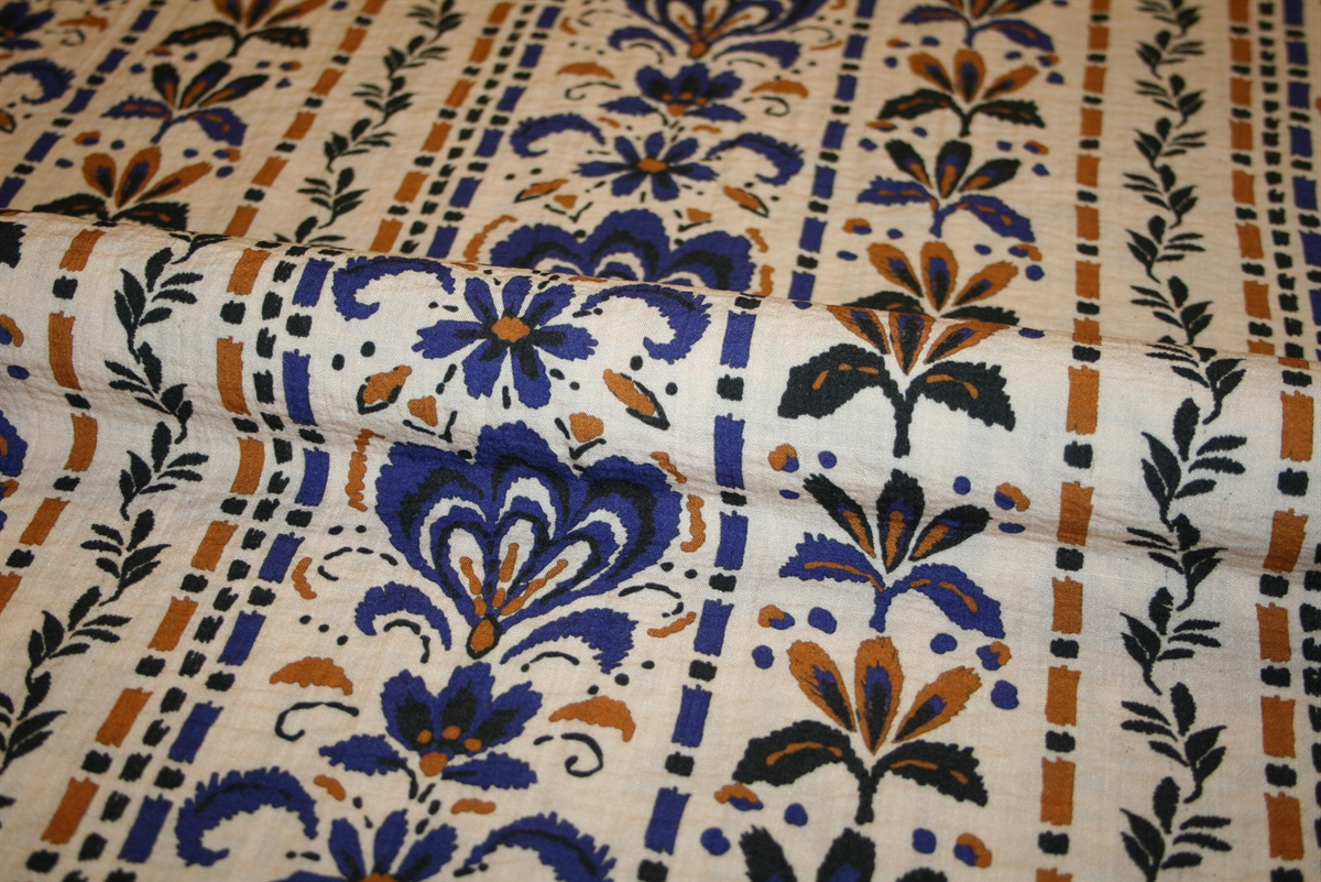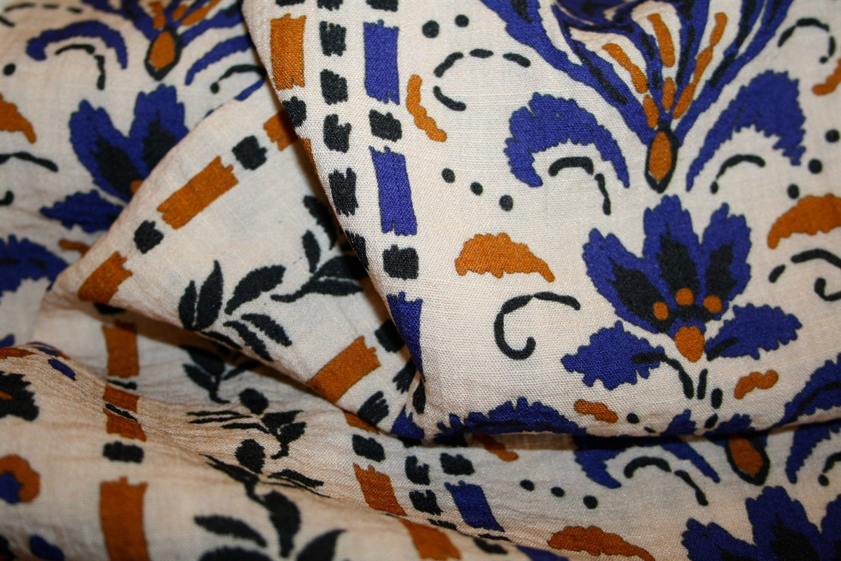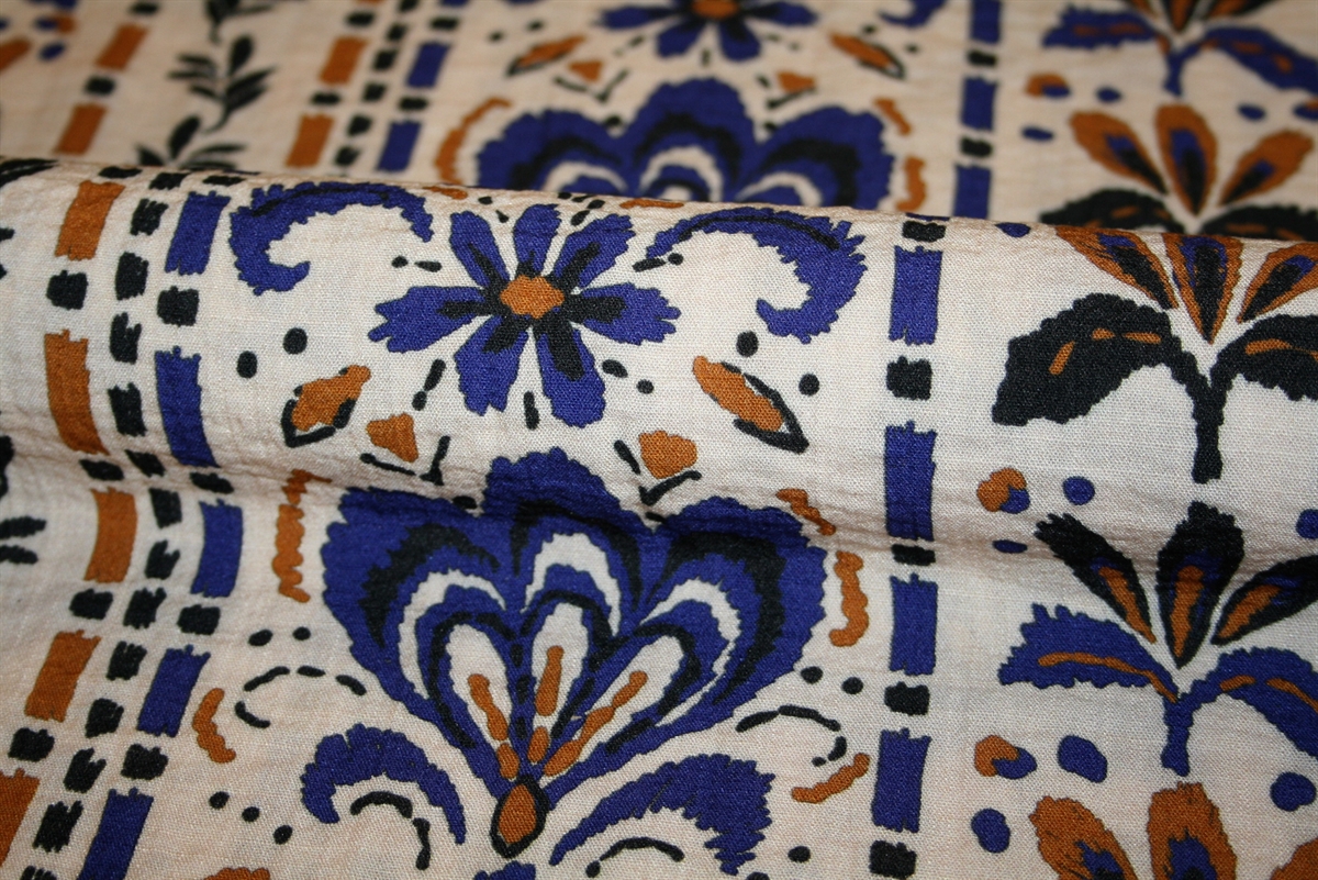 Viskose crepe med middelhavsinspireret print i blå og okker