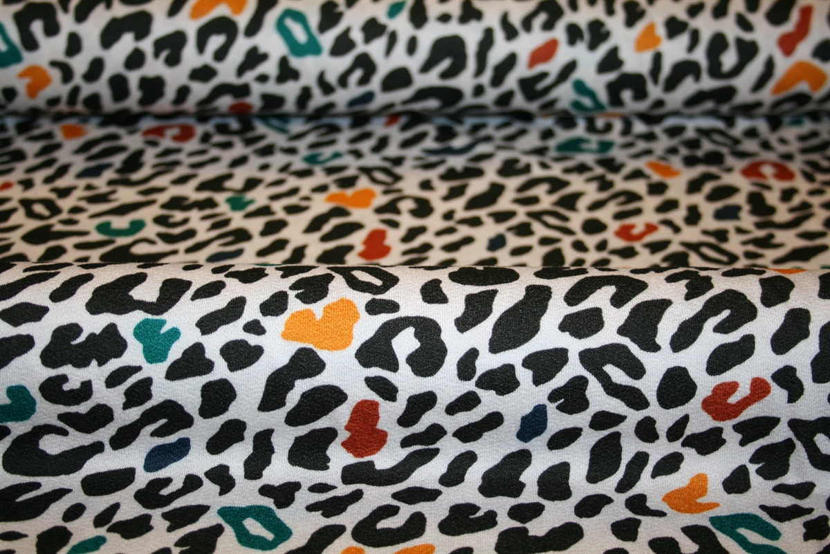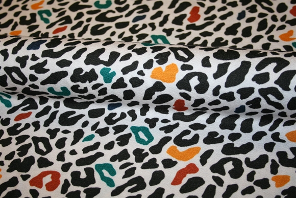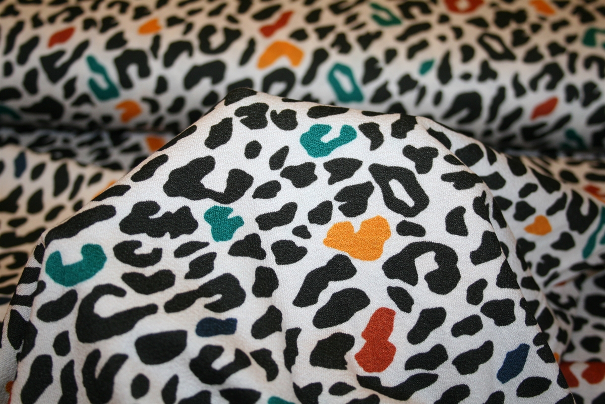 Viscose crepe jersey med dyreprint på en hvid bund. Den let krusede overflade fremkommer ved at benytte hårdt tvundne (twistede) garner, når stoffet strikkes.