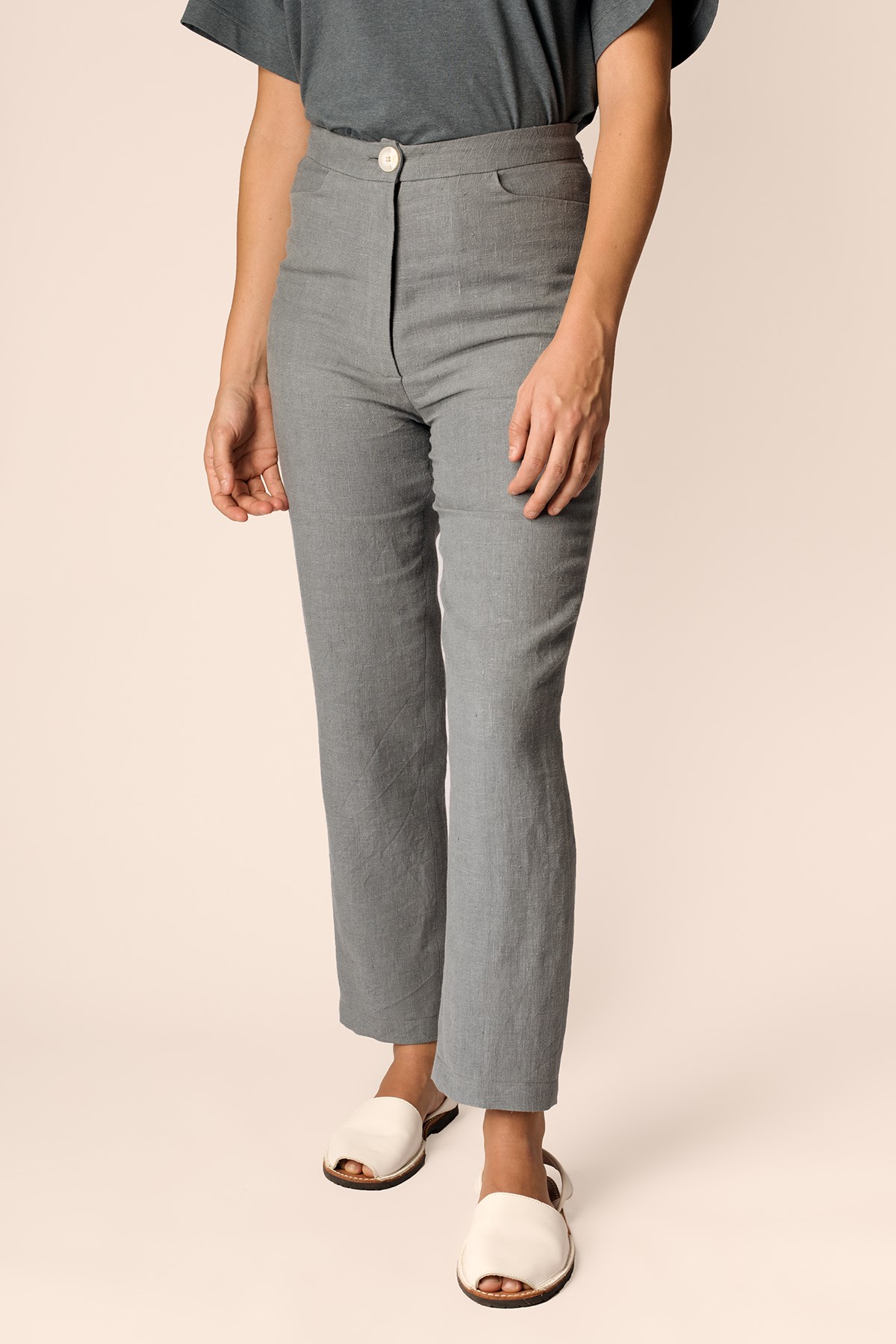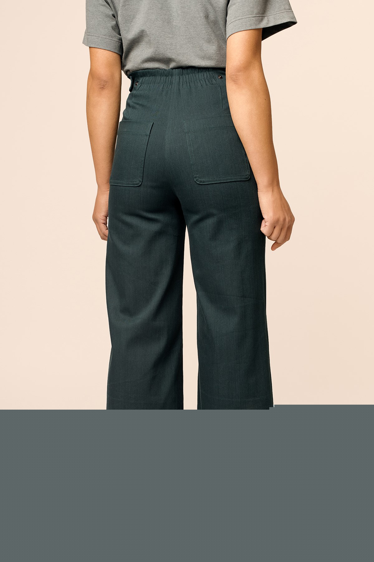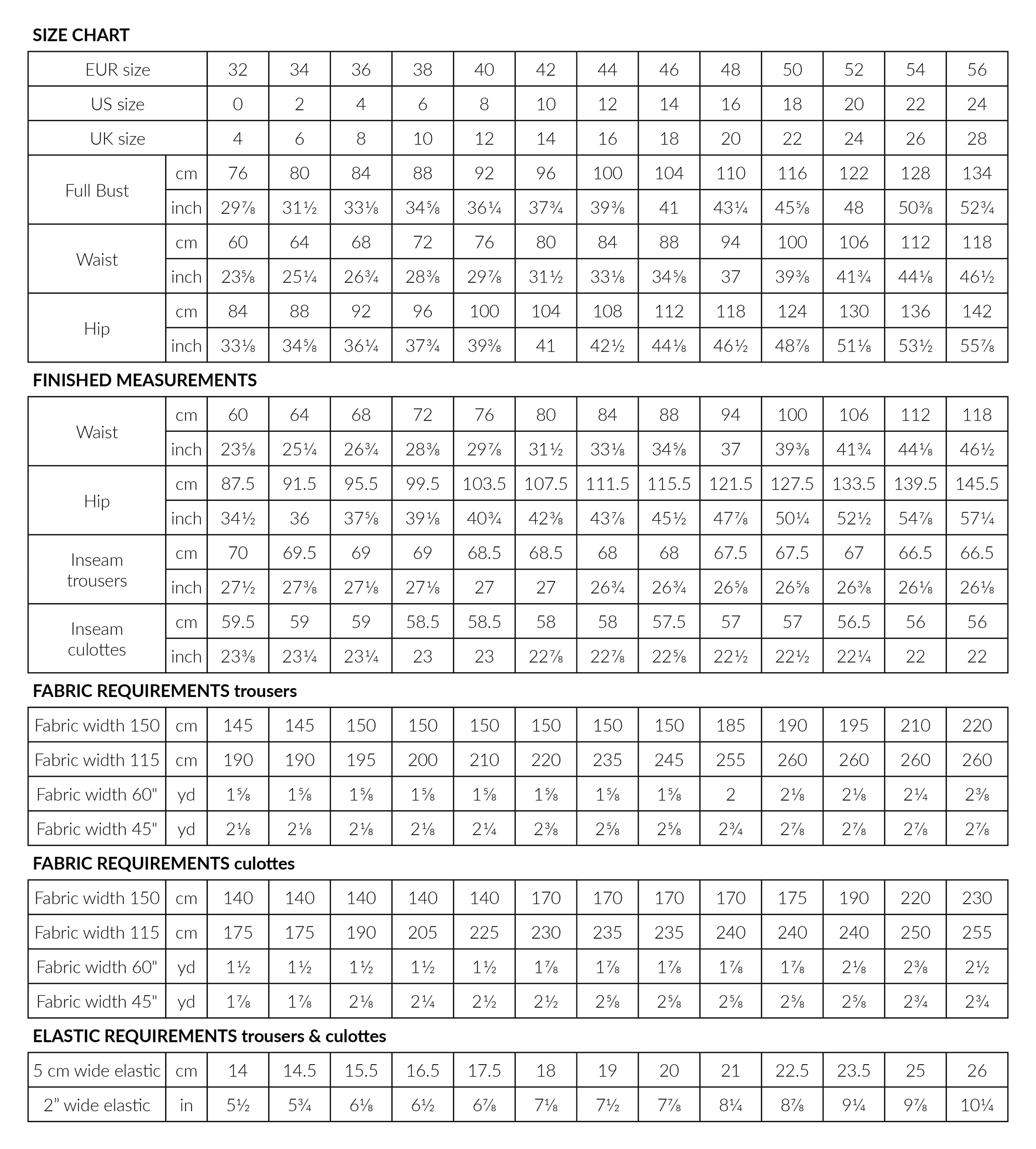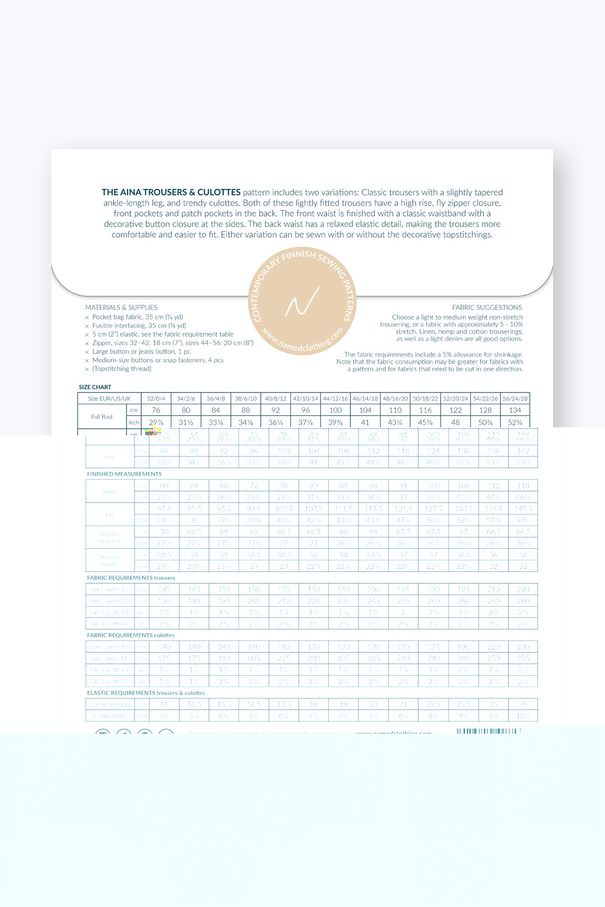 "The Aina pattern includes two variations: Classic trousers with a slightly tapered ankle-length leg, and trendy culottes. Both of these lightly fitted trousers have a high rise, fly zipper closure, front pockets and patch pockets in the back. The front waist is finished with a classic and clean waistband with a decorative button closure at the sides. The back waist has a relaxed elastic detail, making the trousers more comfortable and easier to fit. Either variation can be sewn with or without the decorative topstitchings."