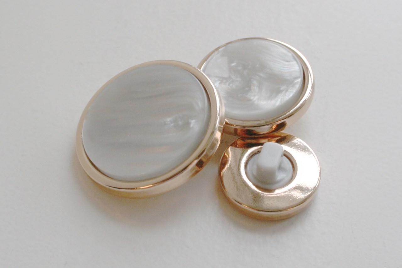 Råhvid emalje øjeknap i guldramme.