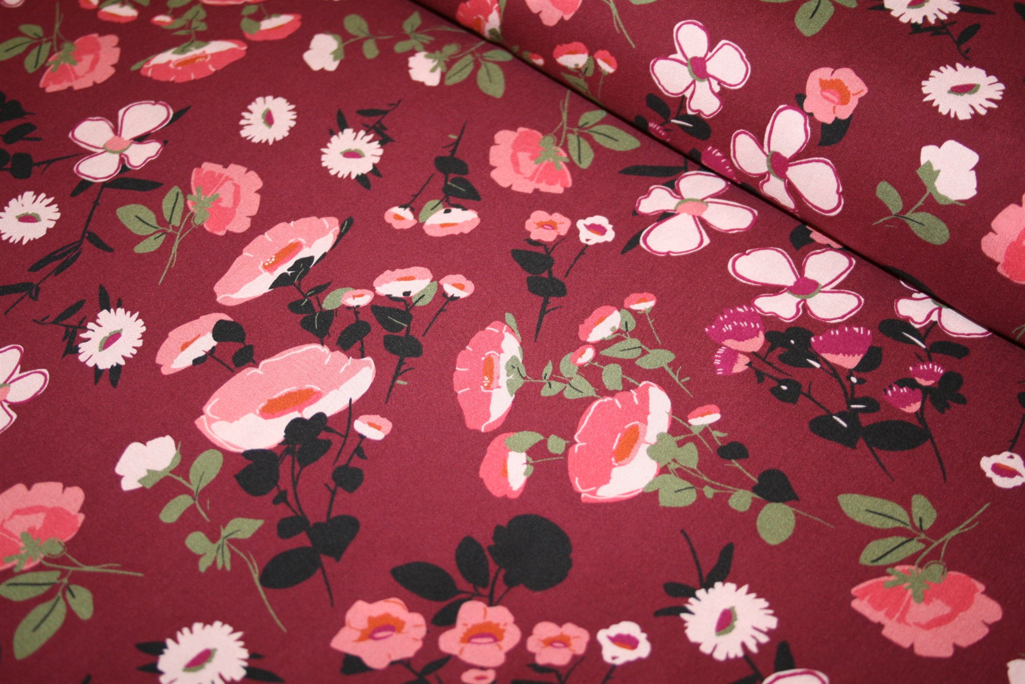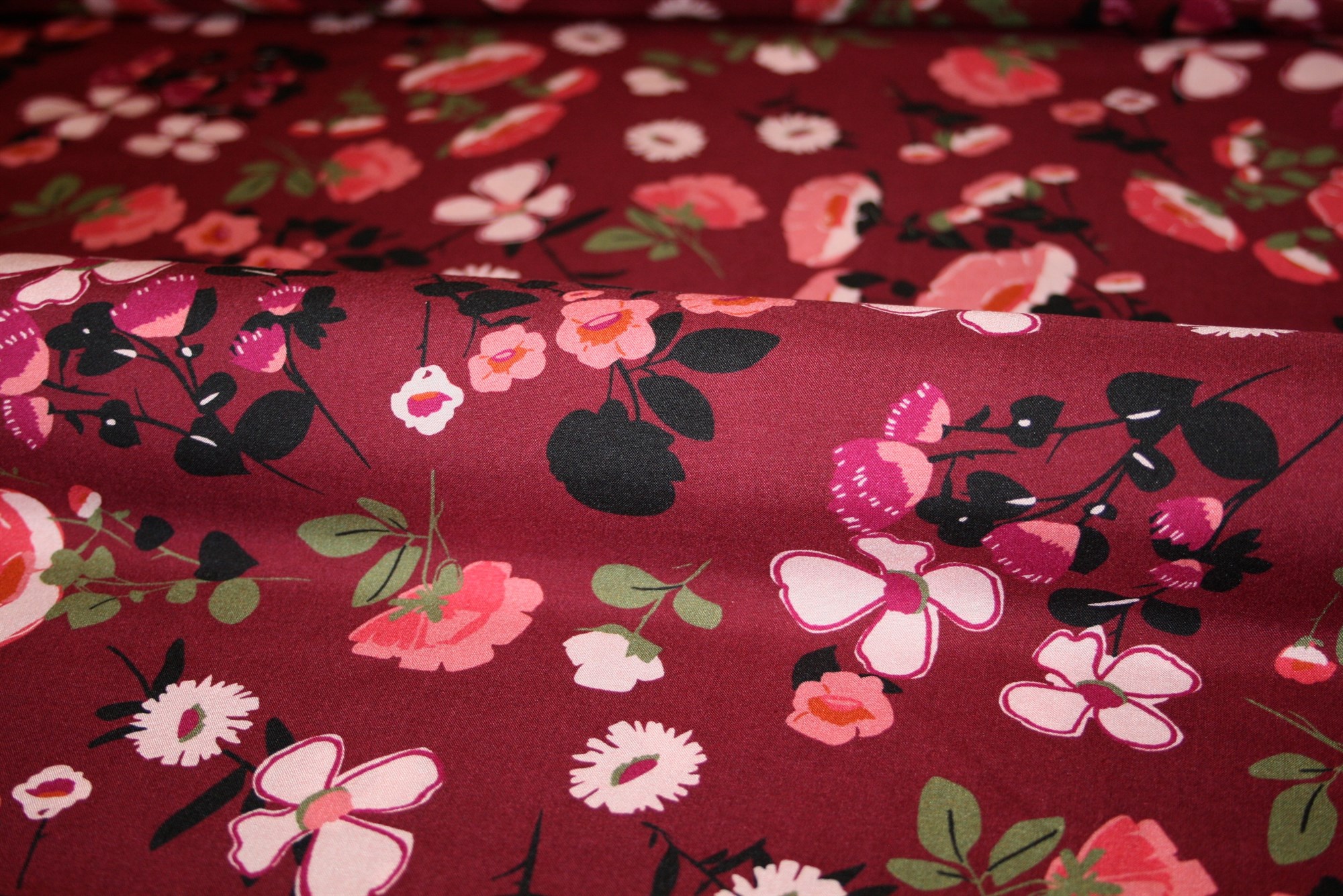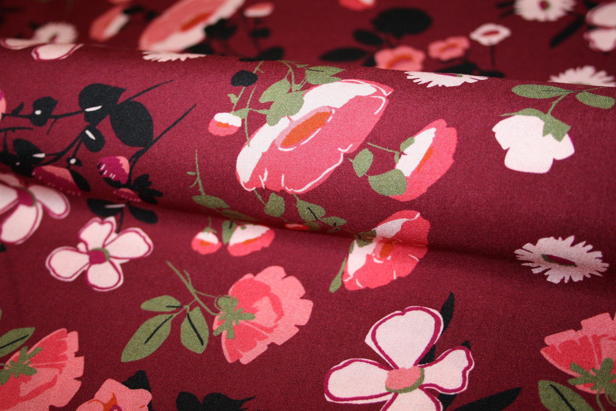 Blød og lækker viskose med botanisk print i lyserød, olivengrøn og råhvid på en sort bund.
