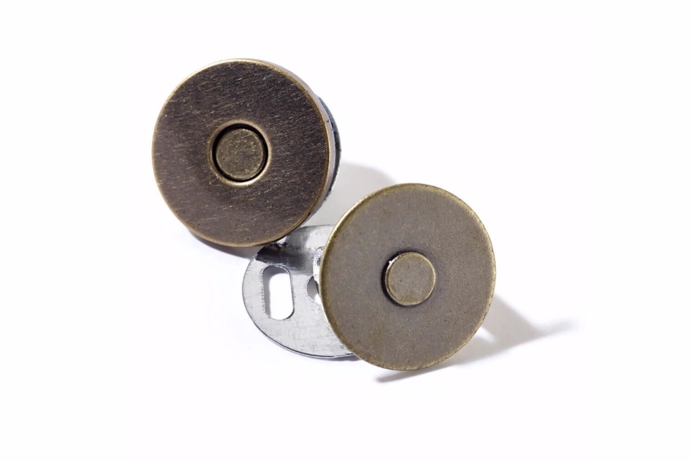 Antik messing magnetlås til brug i fx tasker. Låsen måler 19 mm. i diameter.