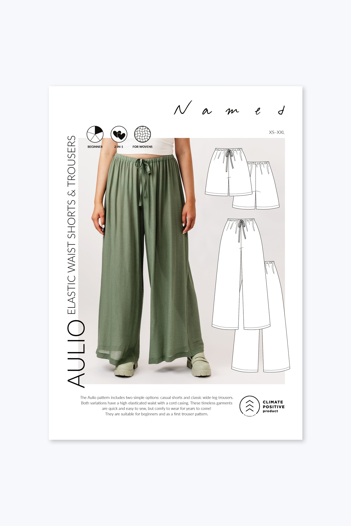 Aulio er både et par afslappede shorts og bukser med brede ben. Begge variationer har en høj elastisk talje med en løbegang til snøre. Super hurtige og nemme at sy - og behagelige at have på!