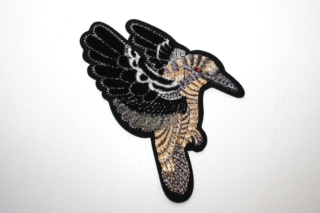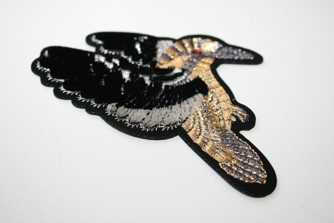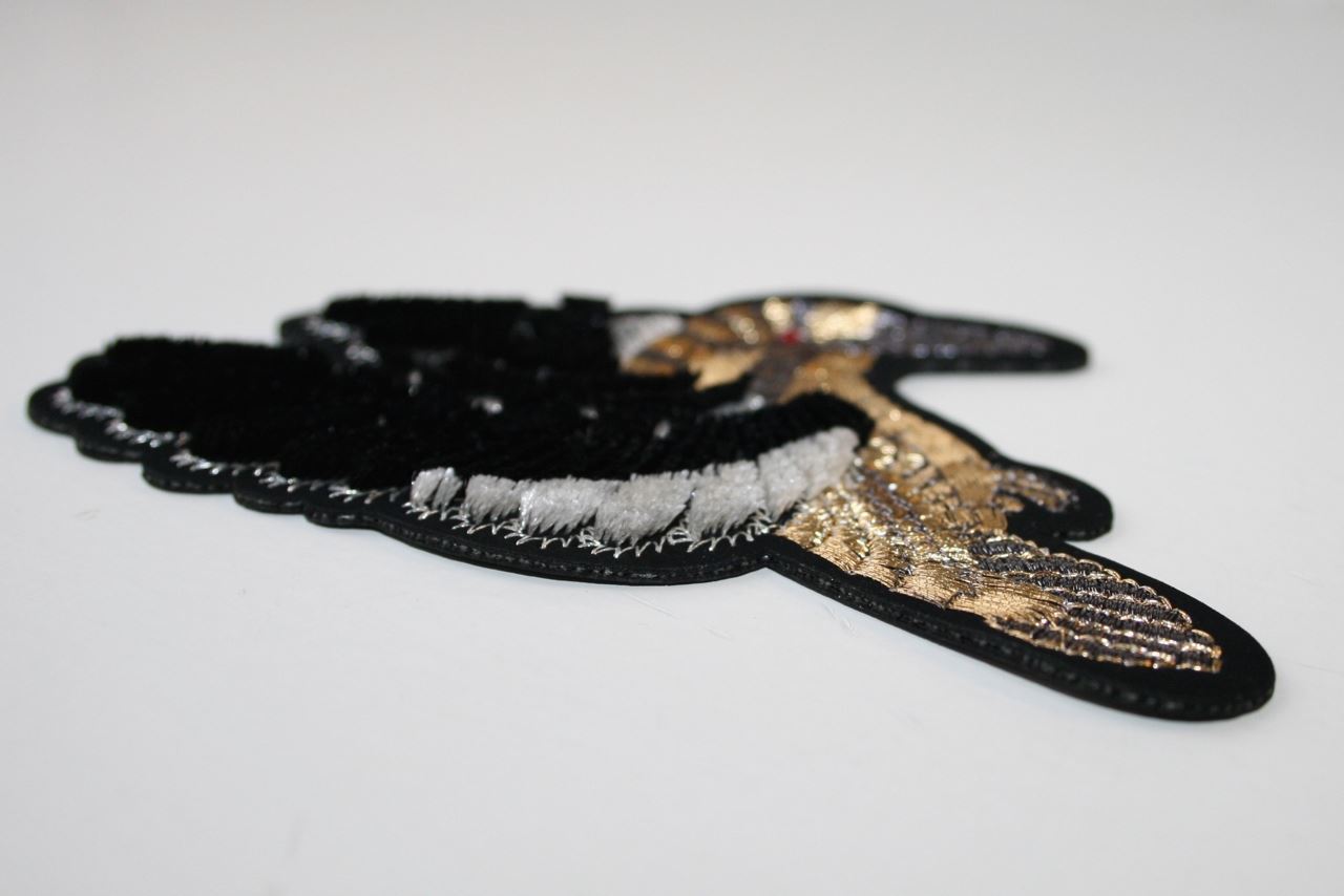 Broderet strygemærke med 'velour' vinger og lurex. Strygemærket kan anvendes til dekoration på beklædning (fx cowboy jakke) og accessories (fx taske og sko).