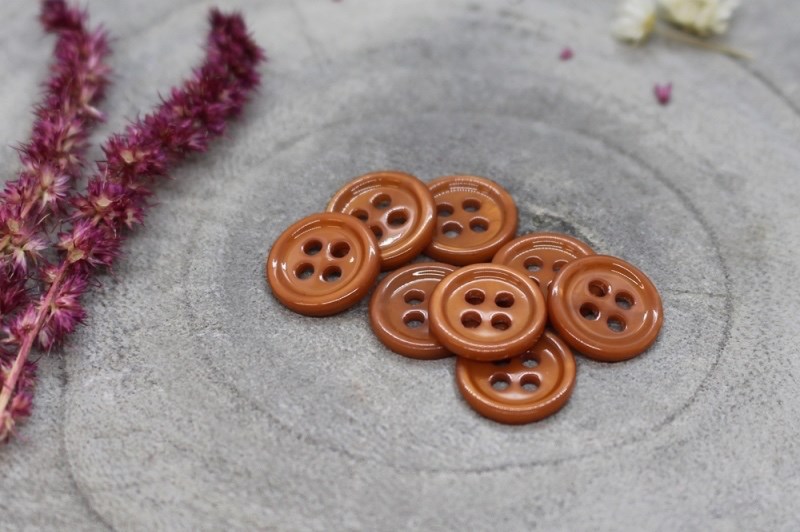 Skinnende brun perlemorsknap med 4 huller. Knapper måler 11 mm. i diameter. Sy perlemorsknapperne i dine hjemmesyede skjorter, bluser, kjoler og striktrøjer.