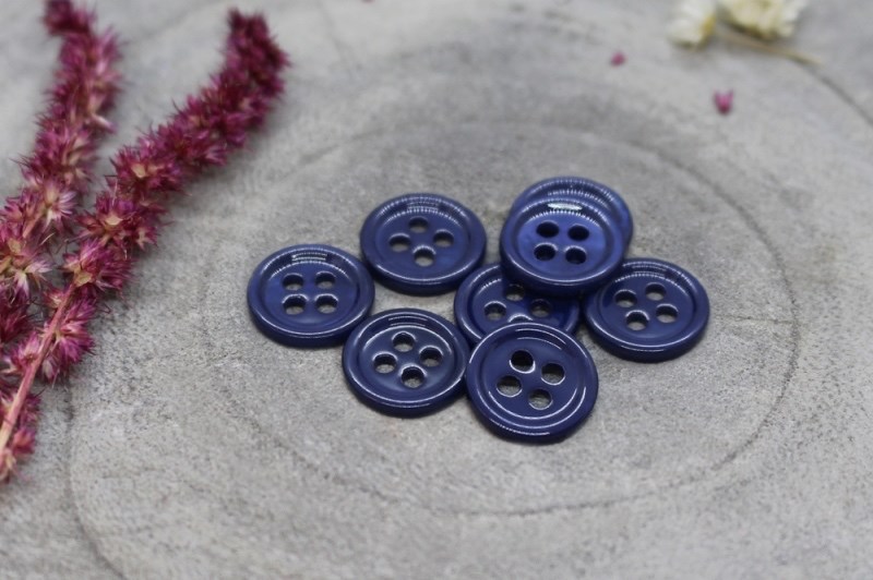 Skinnende kobolt perlemorsknap med 4 huller. Knapper måler 11 mm. i diameter. Sy perlemorsknapperne i dine hjemmesyede skjorter, bluser, kjoler og striktrøjer.