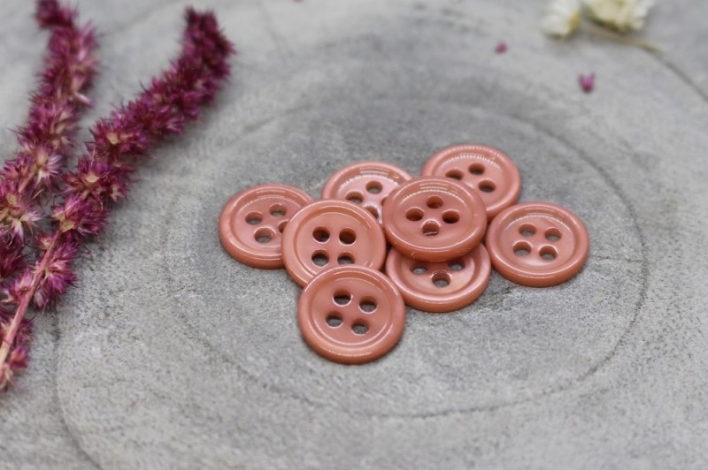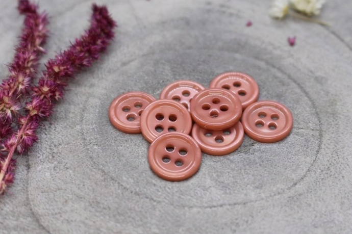 Skinnende rosa perlemorsknap med 4 huller. Knapper måler 11 mm. i diameter. Sy perlemorsknapperne i dine hjemmesyede skjorter, bluser, kjoler og striktrøjer.
