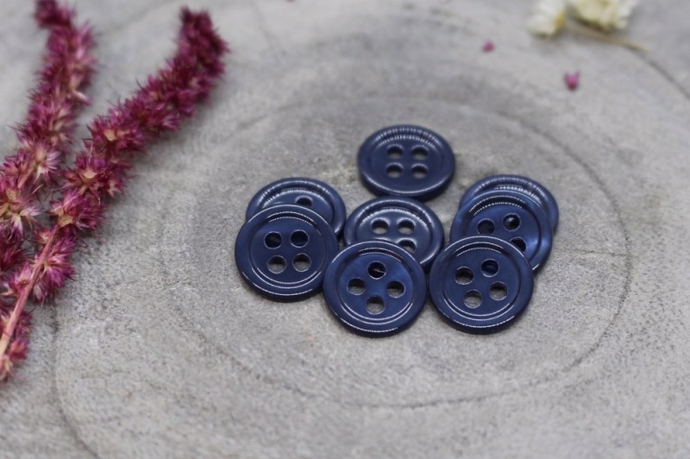 Skinnende navy perlemorsknap med 4 huller. Knapper måler 11 mm. i diameter. Sy perlemorsknapperne i dine hjemmesyede skjorter, bluser, kjoler og striktrøjer.