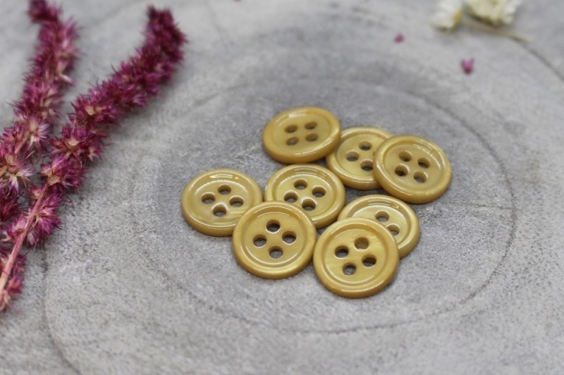 Skinnende okker perlemorsknap med 4 huller. Knapper måler 11 mm. i diameter. Sy perlemorsknapperne i dine hjemmesyede skjorter, bluser, kjoler og striktrøjer.