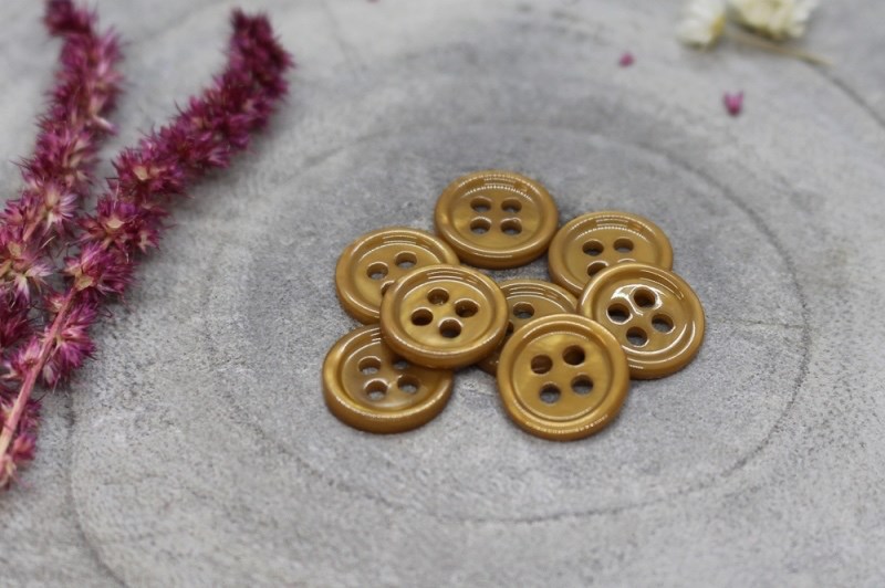 Skinnende okker perlemorsknap med 4 huller. Knapper måler 11 mm. i diameter. Sy perlemorsknapperne i dine hjemmesyede skjorter, bluser, kjoler og striktrøjer.