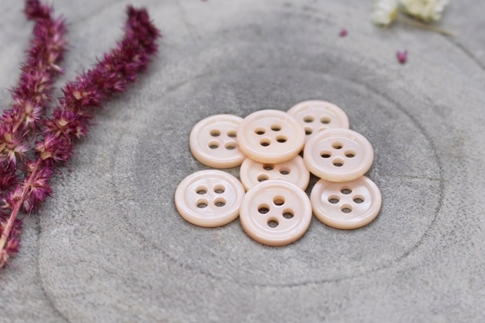 Skinnende lyserød perlemorsknap med 4 huller. Knapper måler 11 mm. i diameter. Sy perlemorsknapperne i dine hjemmesyede skjorter, bluser, kjoler og striktrøjer.