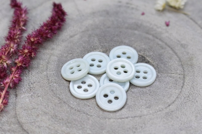 Skinnende lyseblå perlemorsknap med 4 huller. Knapper måler 11 mm. i diameter. Sy perlemorsknapperne i dine hjemmesyede skjorter, bluser, kjoler og striktrøjer.