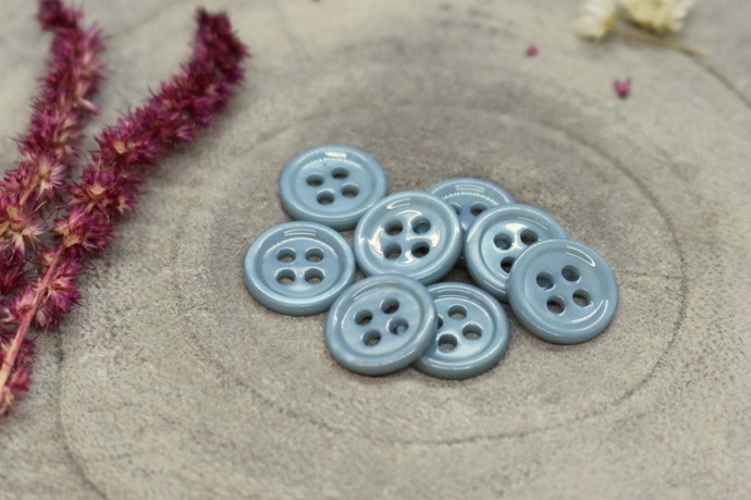 Skinnende stålblå perlemorsknap med 4 huller. Knapper måler 11 mm. i diameter. Sy perlemorsknapperne i dine hjemmesyede skjorter, bluser, kjoler og striktrøjer.