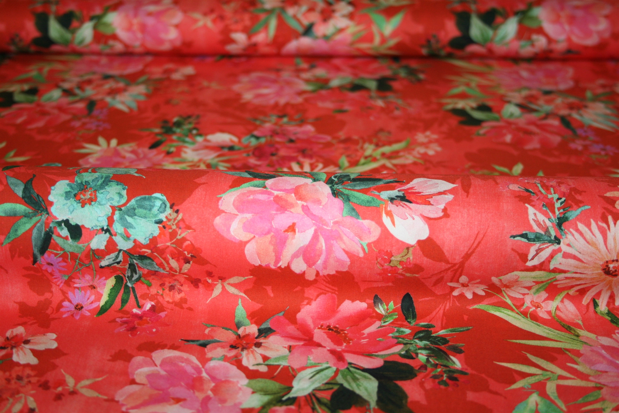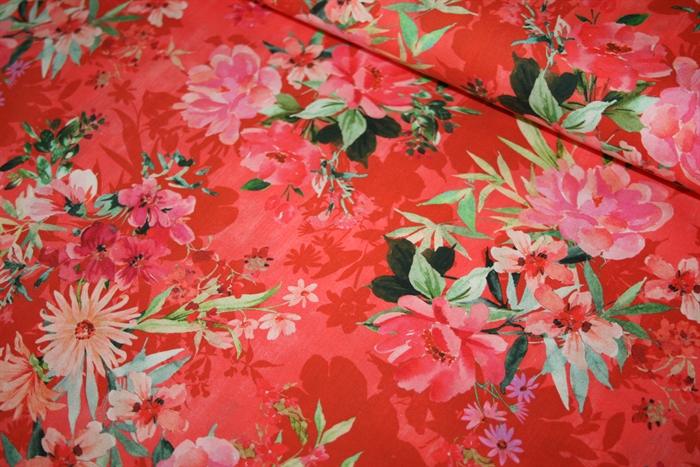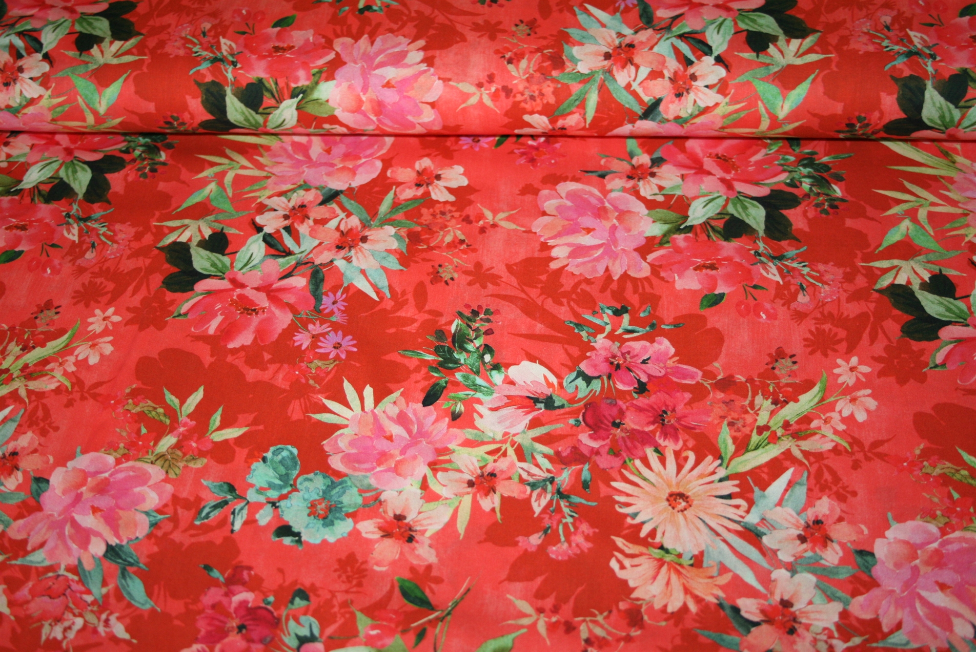 100% bomuld med et smukt blomsterprint på en koralrød bund. Kvaliteten er let og tæt.