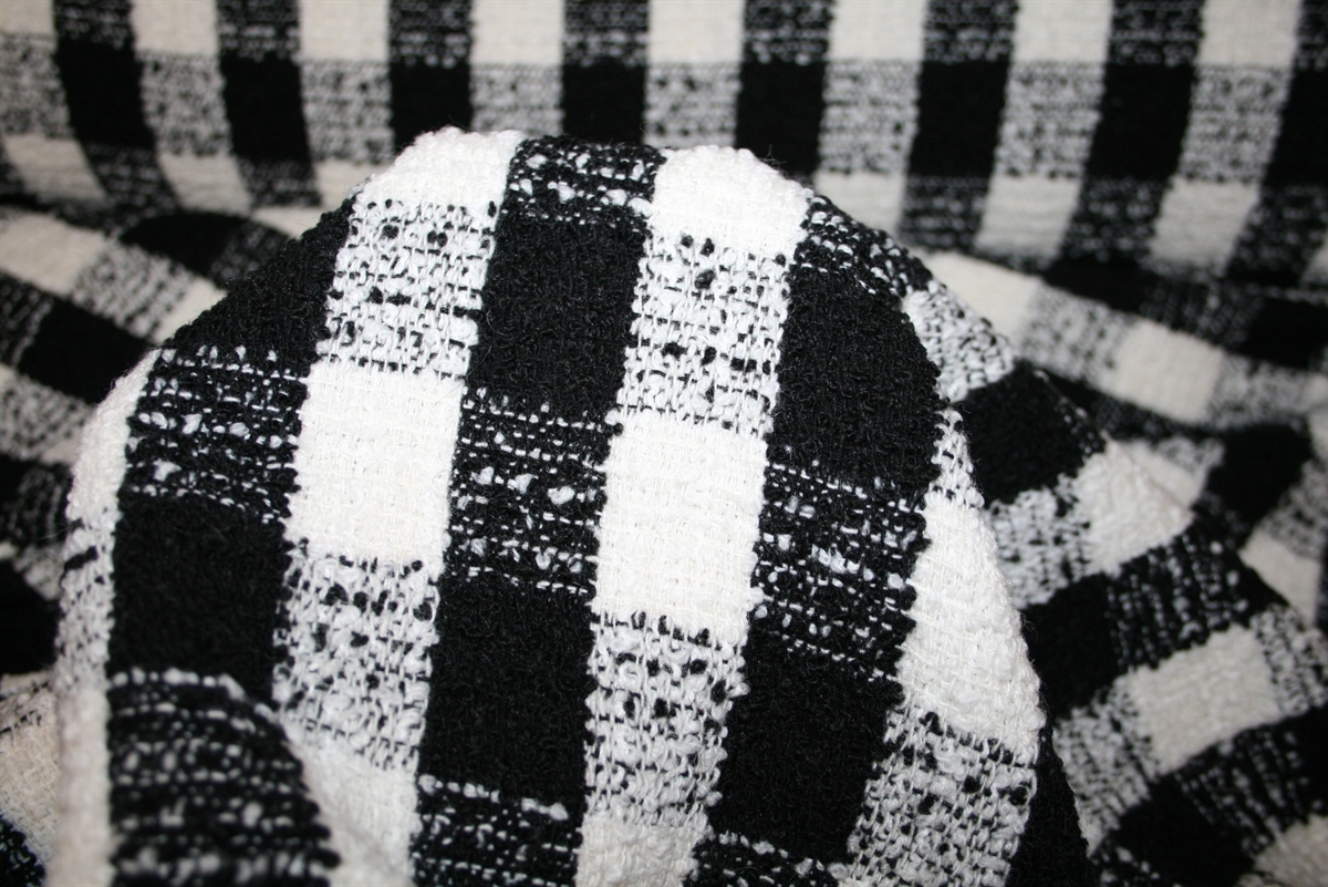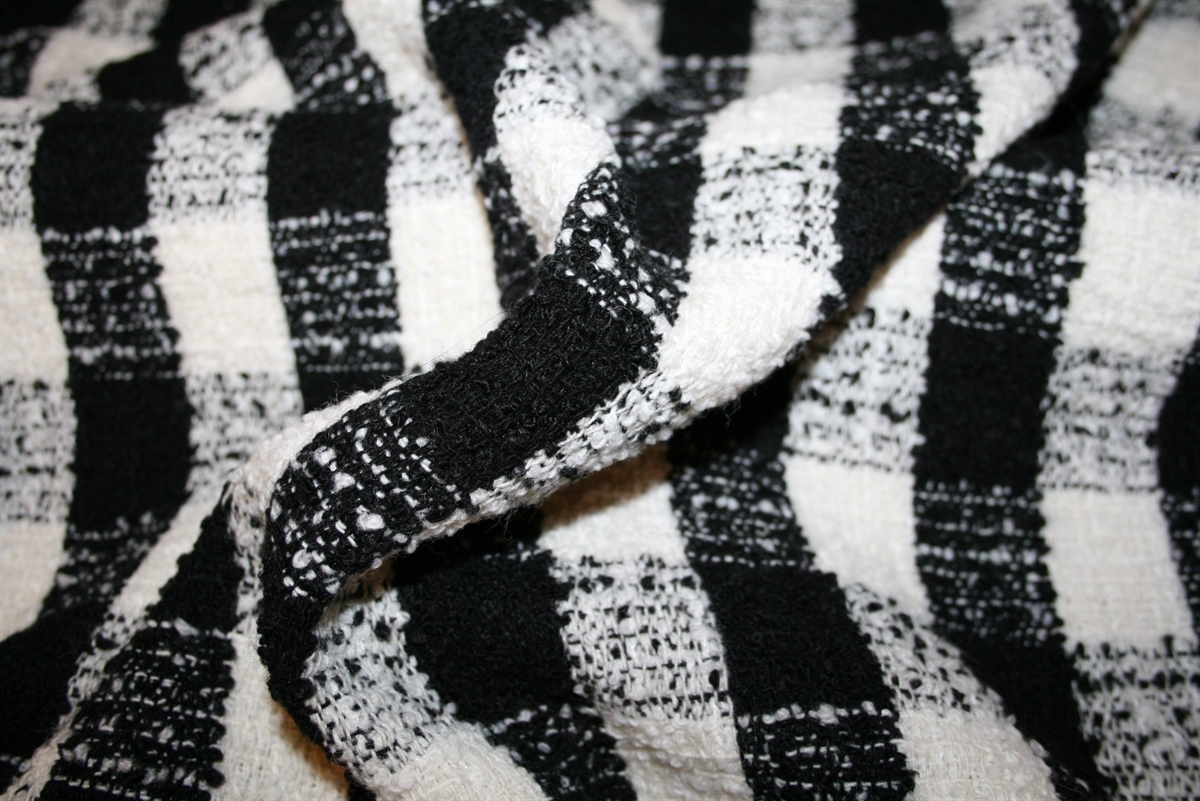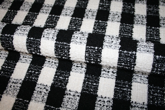 Lækker skakternet bouclé uldblanding. Ternene måler ca. 3*4 cm. Kvaliteten er blød og medium kraftig.
