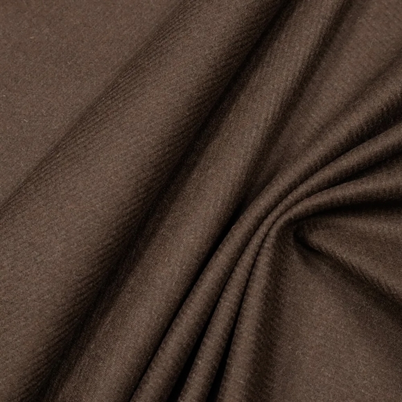 Et smukt og tidløst frakkestof i høj kvalitet, vævet af en uldholdig blanding, der gør det både varmt, slidstærkt og behageligt at have på. Stoffet har en tæt vævning og en blød, lun overflade, som gør det ideelt til efterårs- og vinterprojekter. Den klassiske kiperbinding (diagona/twilll vævning) giver stoffet et elegant og struktureret udtryk, der giver stoffet karakter. Den brune nuance er nem at kombinere med neutrale toner som creme, sort, grå og camel.