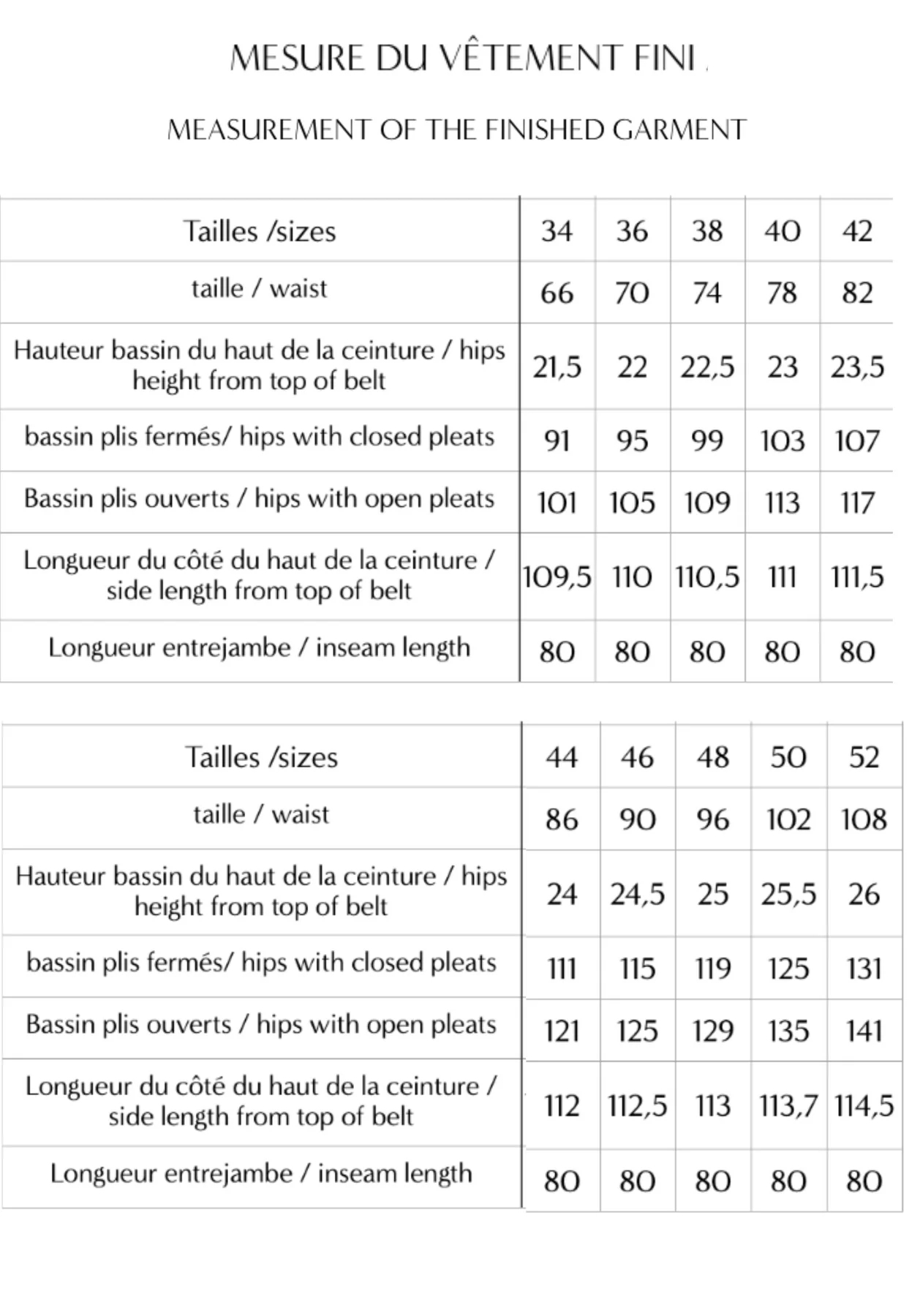 Sewing level : The technical points are the realization of the pleats on the front of the pants, the assembly of the belt, the Italian pockets and the installation of the invisible zip."