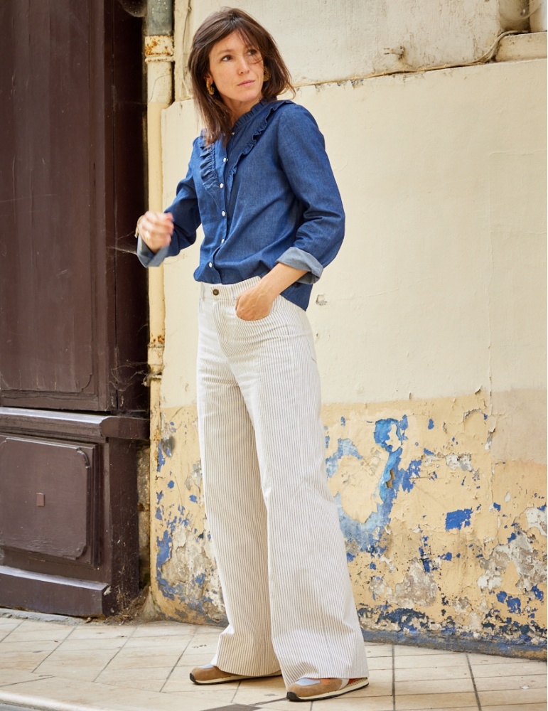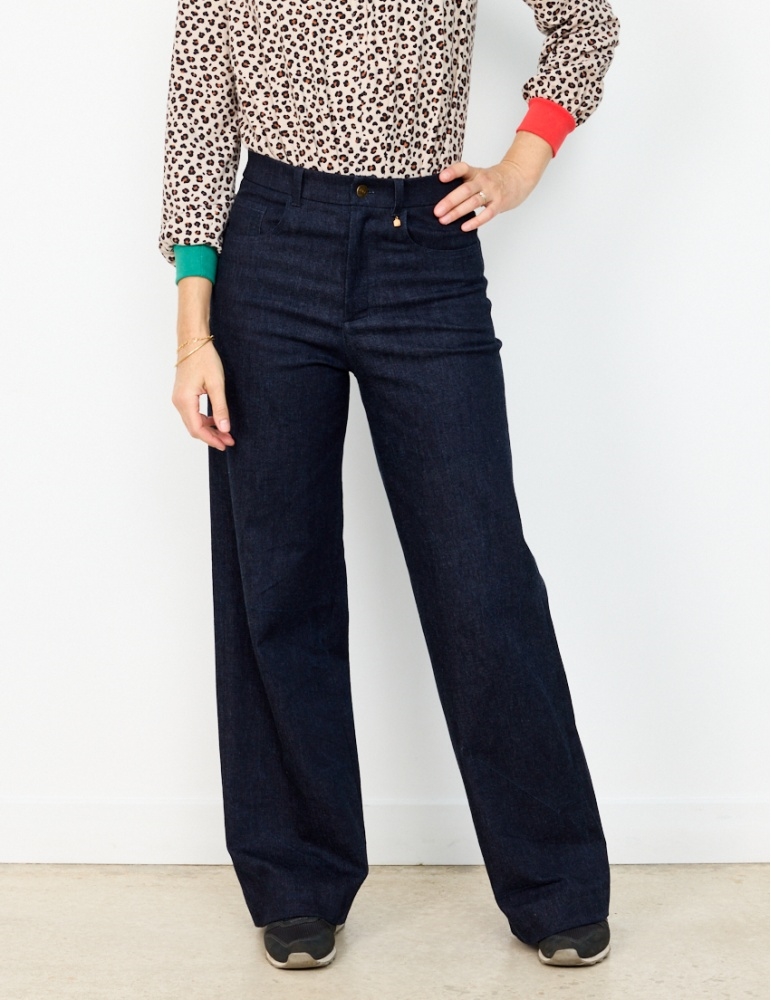 "These wide-leg pants are close-fitting from high-rise waist to the lower hips and largely flare out to the hem for a cool look. True archetype of jeans with its distinctive details (fob and rounded pockets on the front, topstitched yoke and back patch pockets), they are both original and stylish. Can be made into shorts finished with a topstitched cuff."