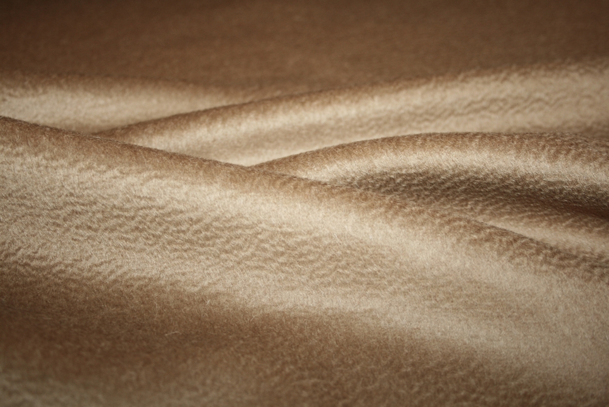Smuk camel-farvet frakkeuld i en medium kraftig kvalitet med en eksklusiv bølget prægning i luven. Stoffet er produceret for et kendt modehus.