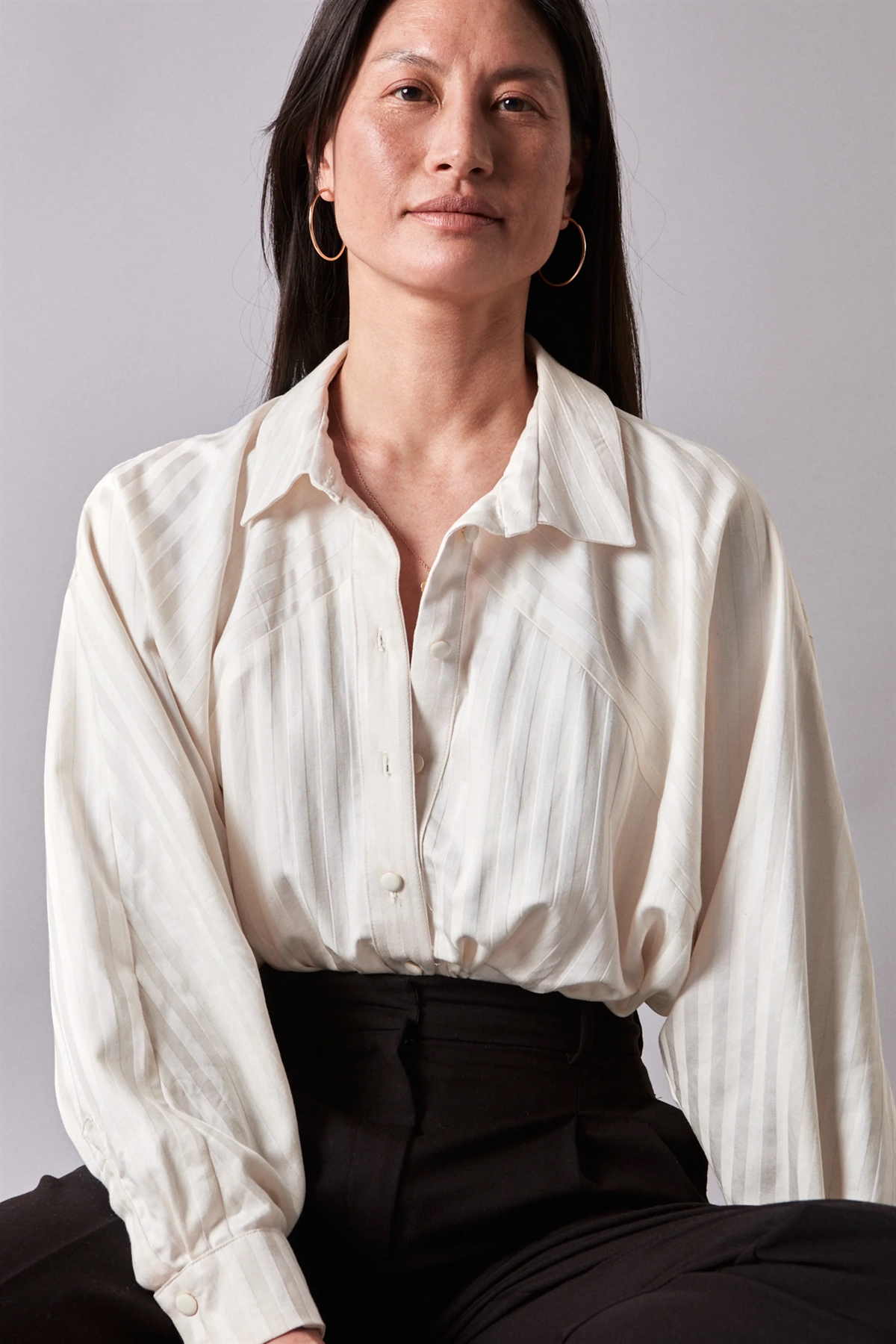 Snitmønster til 'boyfriend' skjortebluse med feminine detaljer, der giver blusen et selvsikkert og elegant udtryk.