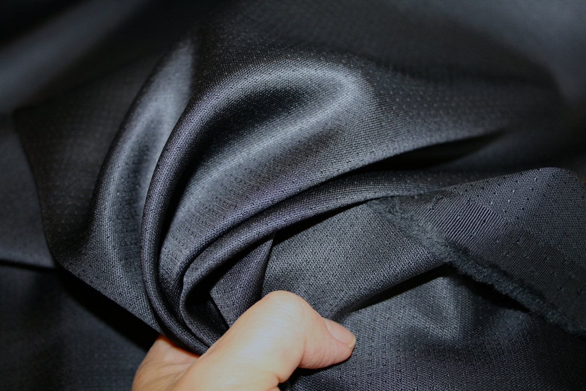 Midnatsblå (næsten sort) uld -og bomuldsblanding i en elegant blank jacquardvævning med små prikker. Kvaliteten er medium kraftig og let spændstig.