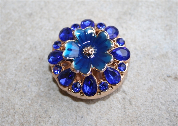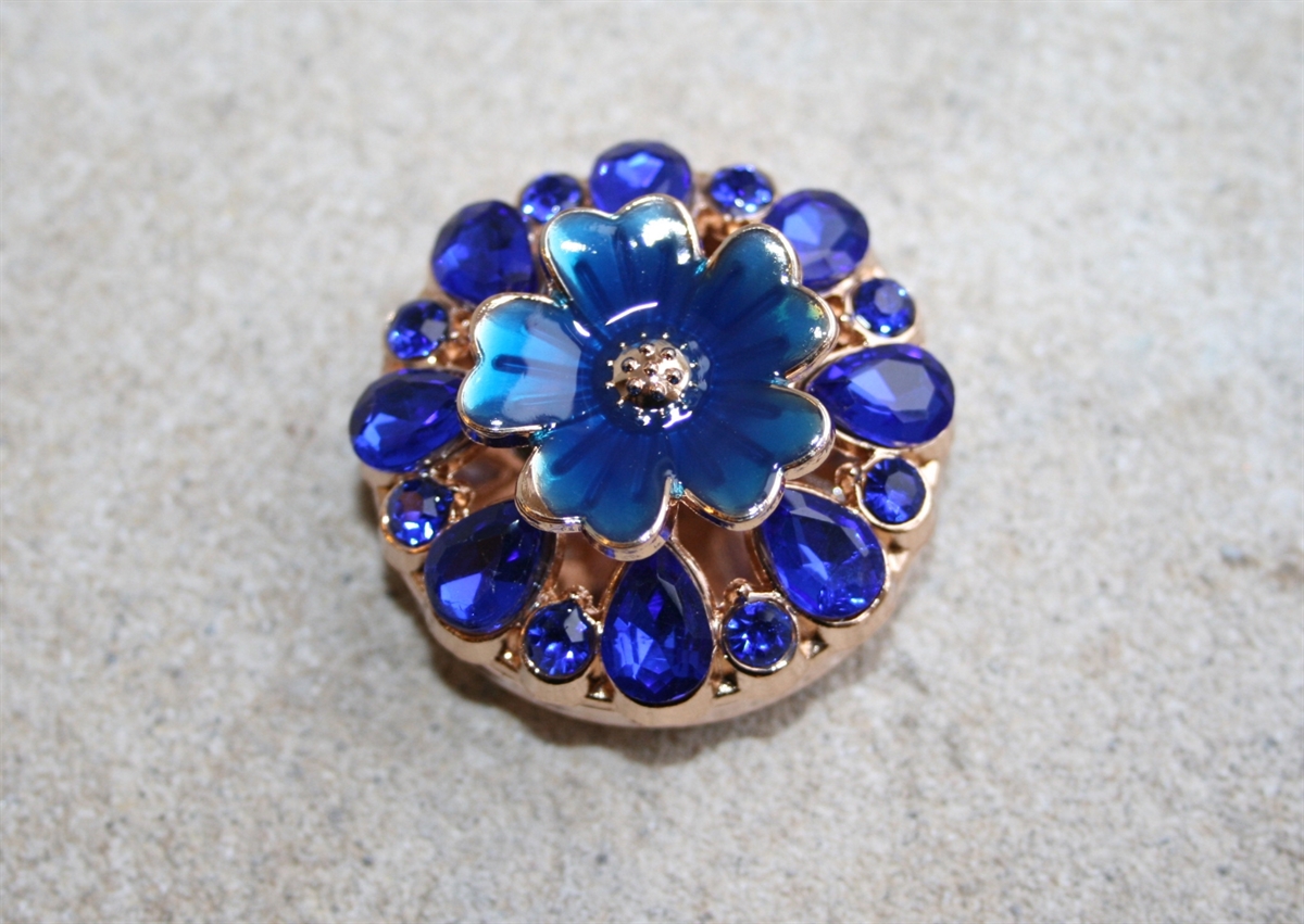 Knappen er udsmykket med en smuk blå blomst i centrum, omgivet af funklende kobolt blå sten i en gylden indfatning. Resultatet er en knap, der emmer af vintage-elegance, luksus og personlighed.