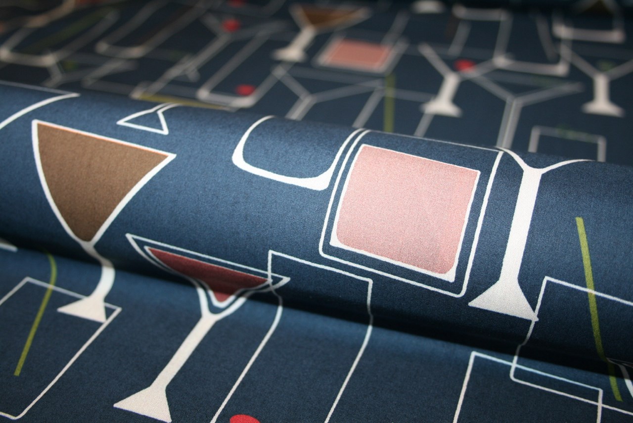 100% bomuld med læskende cocktails på en gråblå bund. Stoffet er i en let crisp og tæt vævning.