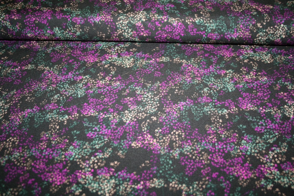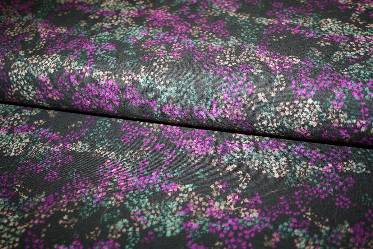 Blød og lækker viskose med botanisk print i lyserød, olivengrøn og råhvid på en sort bund.