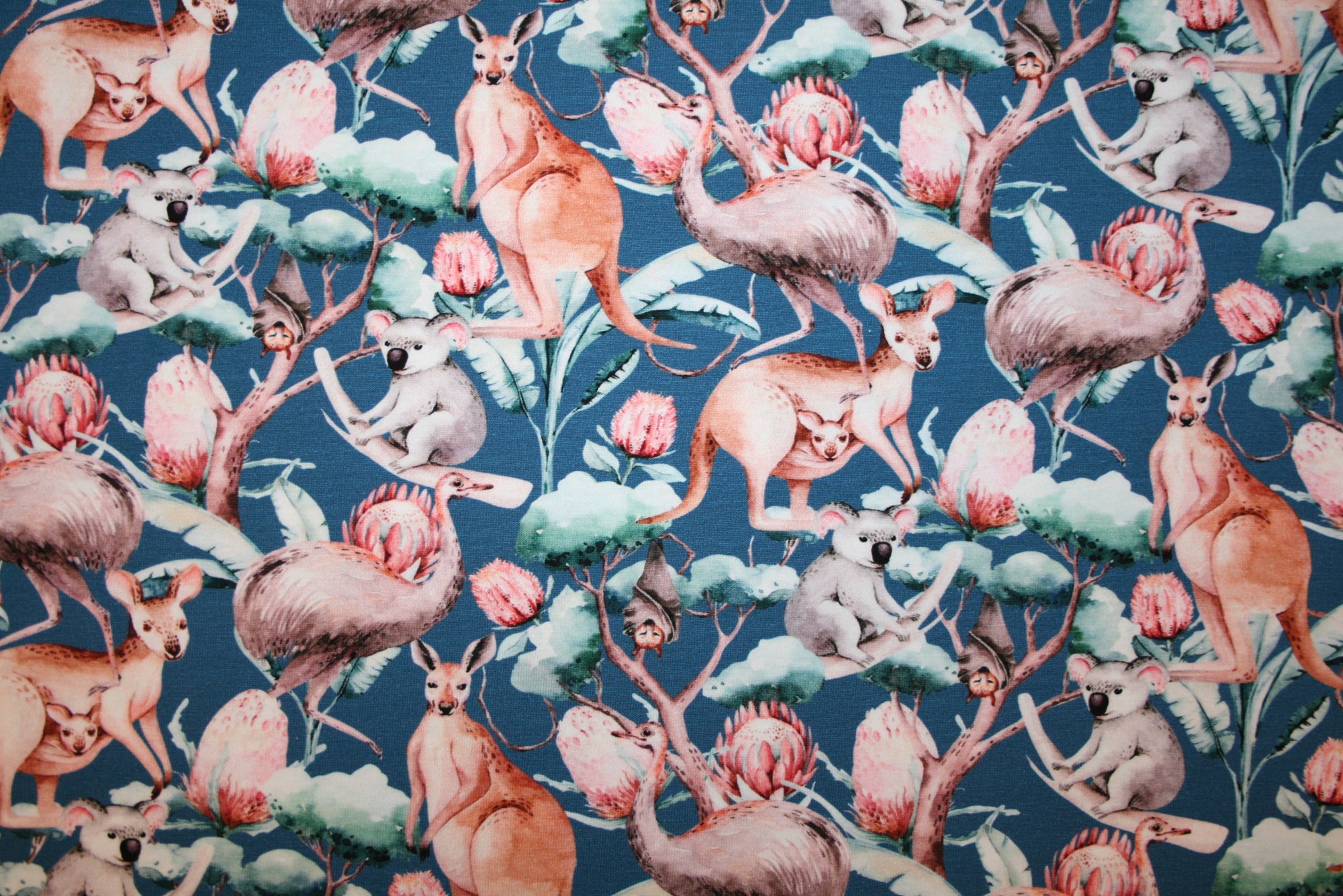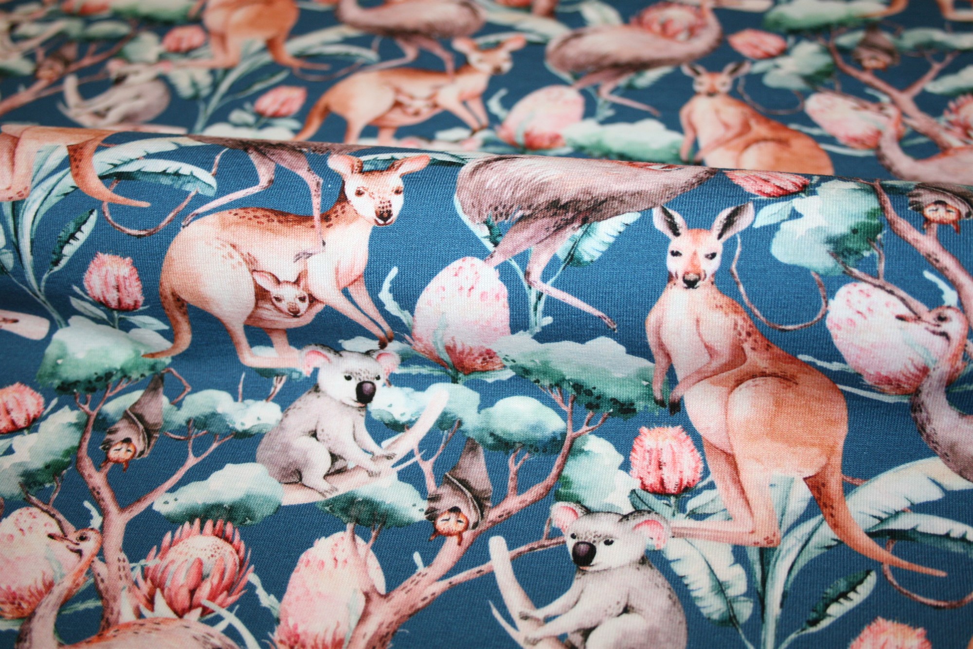 Økologisk bomuldsjersey med et sødt print af dyr. Stoffet er oeko-tex certificeret, dvs. uden skadelig kemi.