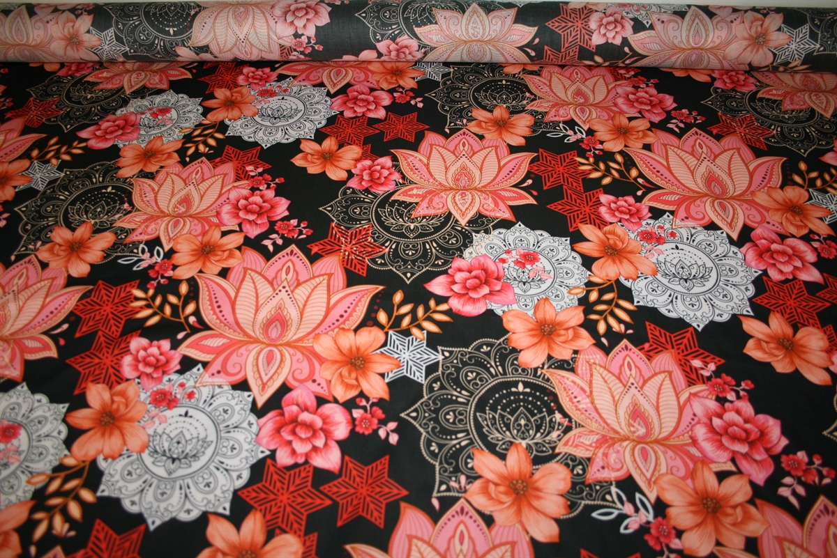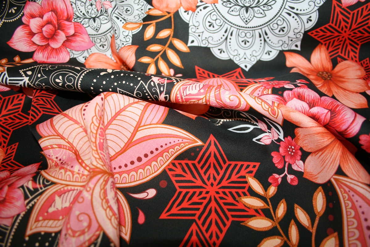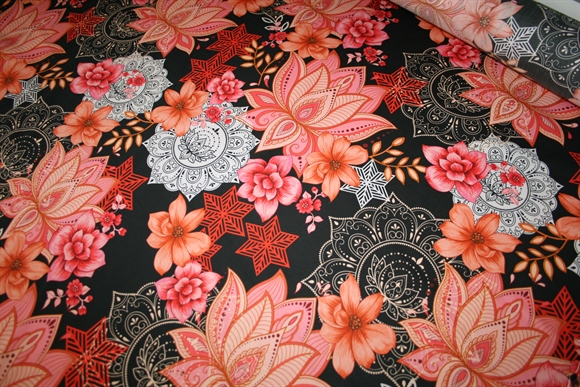 Vævet bomuld med et skønt orientalsk inspireret print på en sort bund. Kvaliteten er let og lækker og er produceret i Italien for et stort kendt brand.