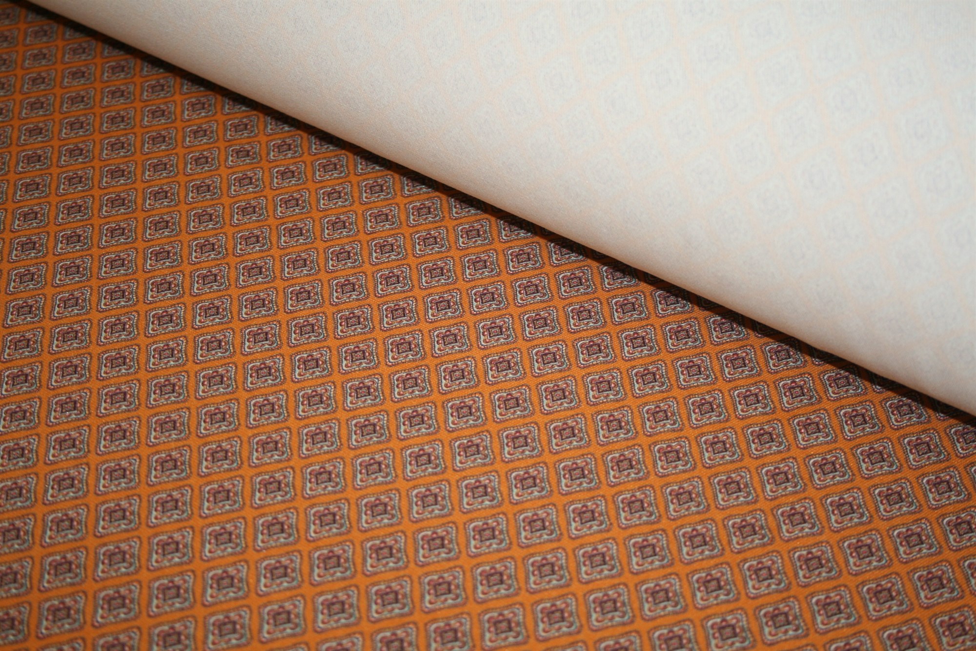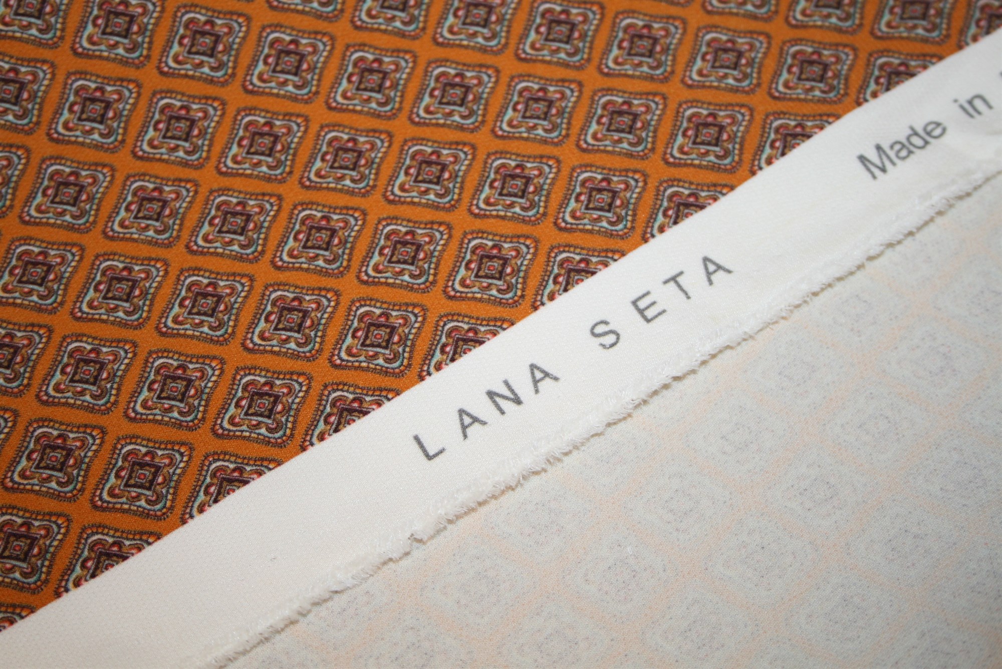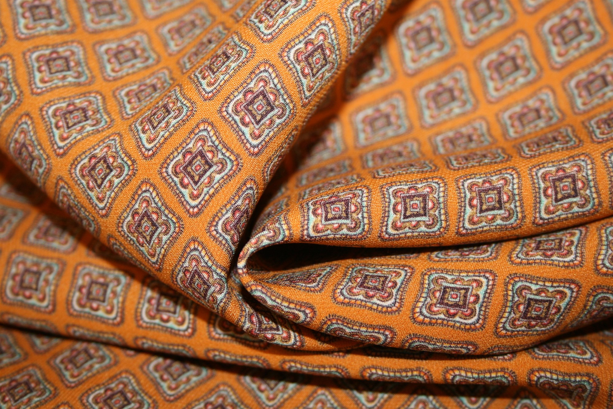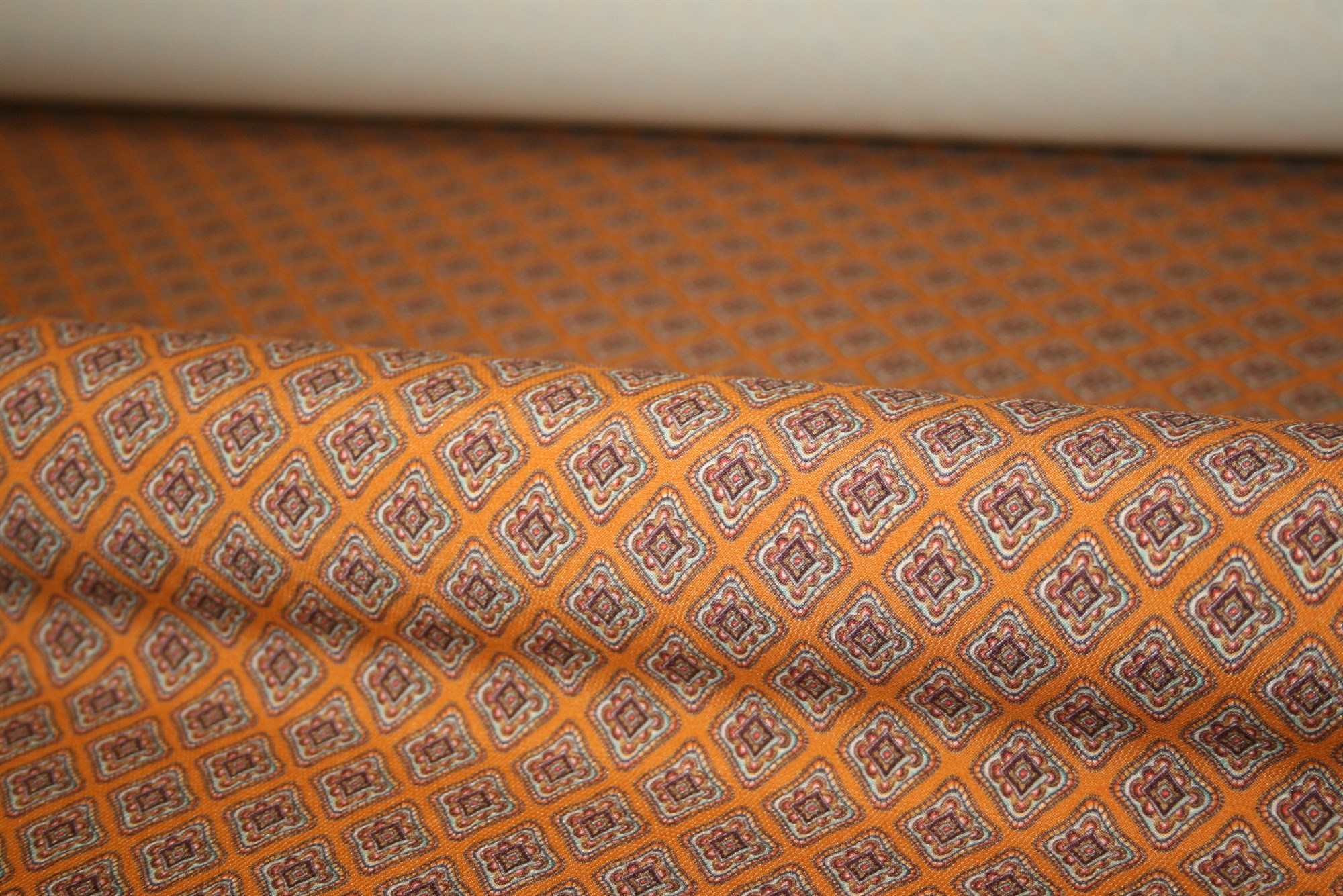 Uld -og silkeblanding med grafiske blomster på en (afdæmpet) orange bund. Kvaliteten er fast, robust og med god fylde, der kan bruges til at understrege skulpturelle effekter i beklædningen (fx. volumniøse ærmer). Stoffet er produceret for Aspesi.