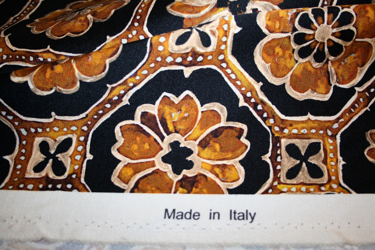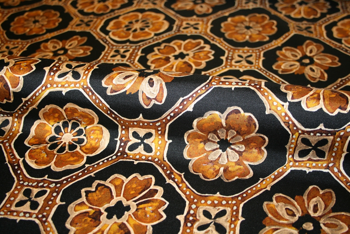 Deadstock uld -og silkeblanding med grafisk print i okker og sort