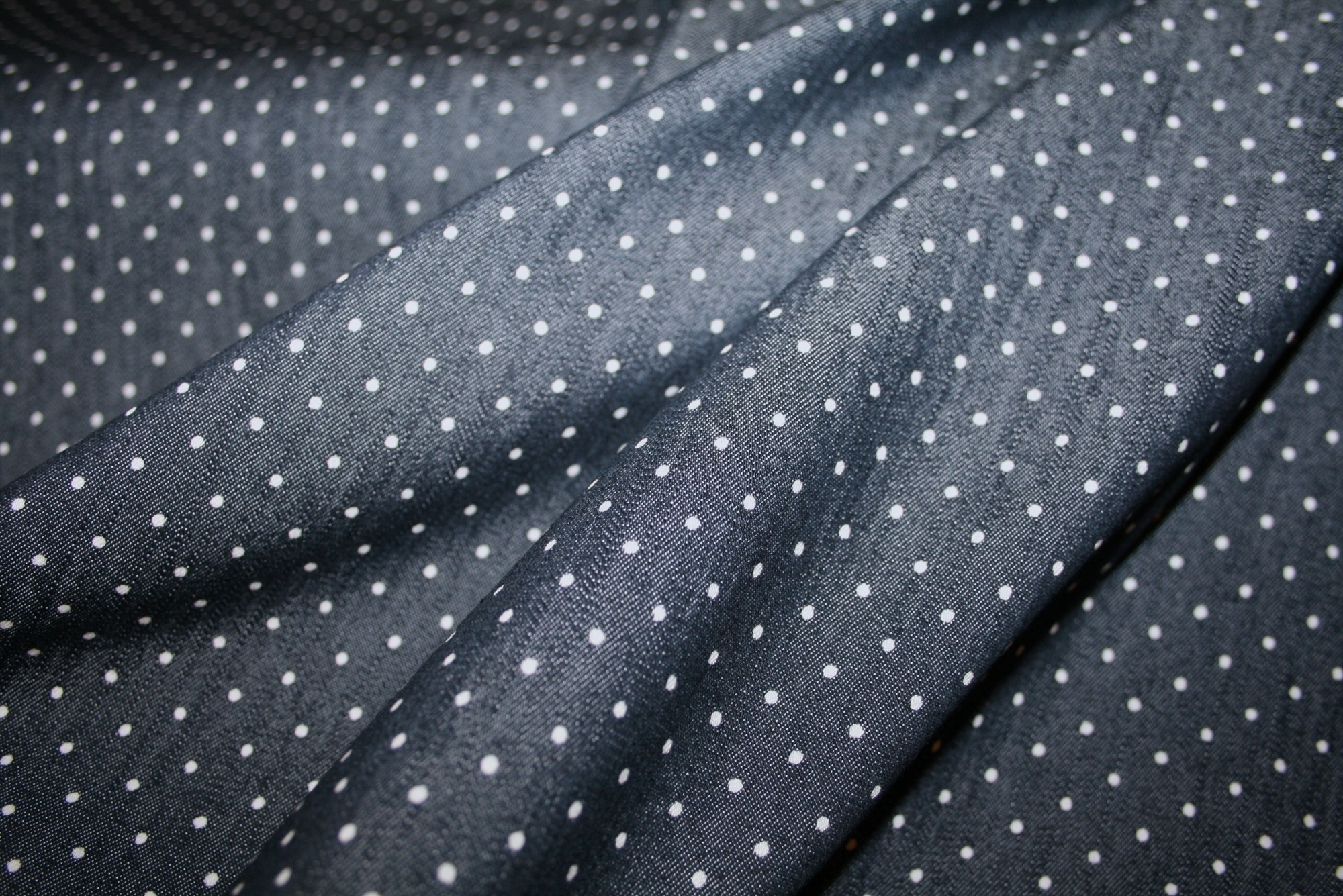 Denim look bomuldsstretch med små hvide prikker. Kvaliteten er medium kraftig.