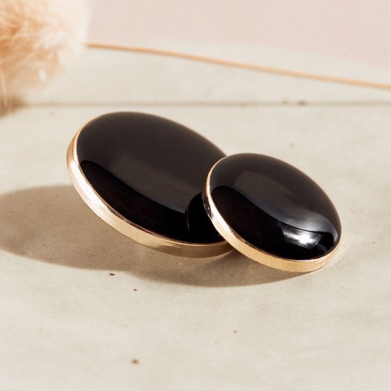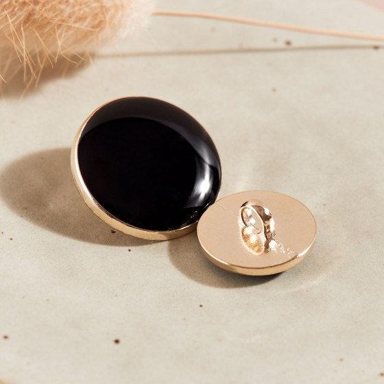 Sort emalje øjeknap i guldramme.