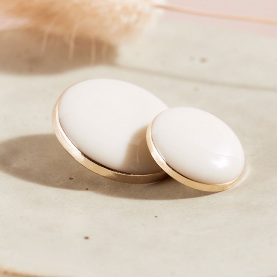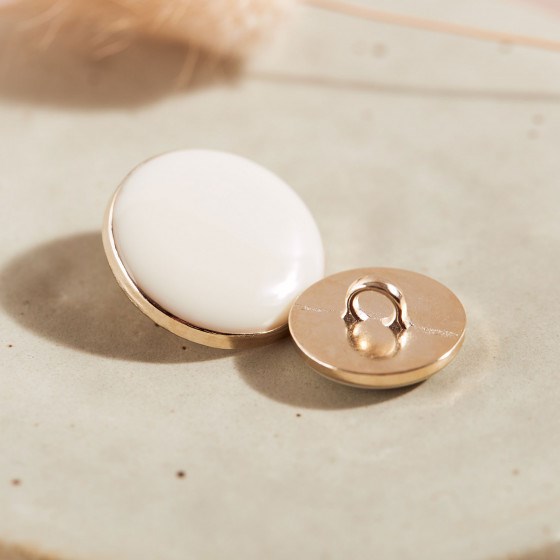 Råhvid emalje øjeknap i guldramme.