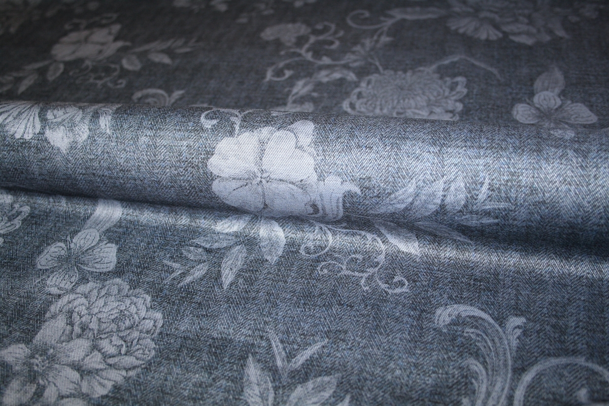 Twillvævet bomuld i denimlook med print af blomster og sildeben. Kvaliteten er let og blød og giver sig en smule på tværs. Stoffet er produceret i Italien for et kendt brand.