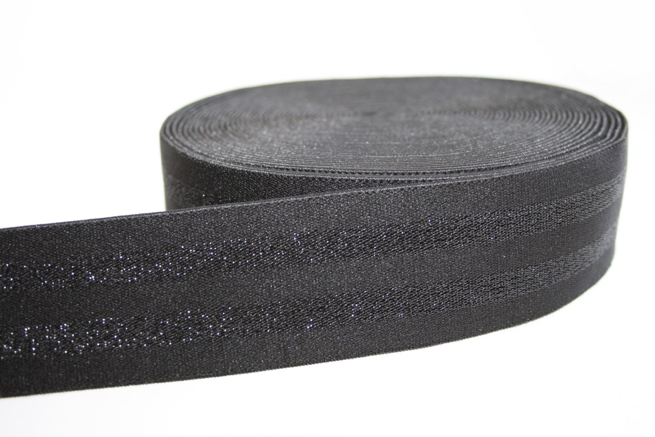 Blød sort elastik med sorte lurex striber. Elastikken er 40 mm bred.