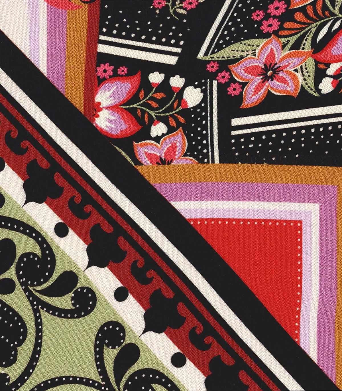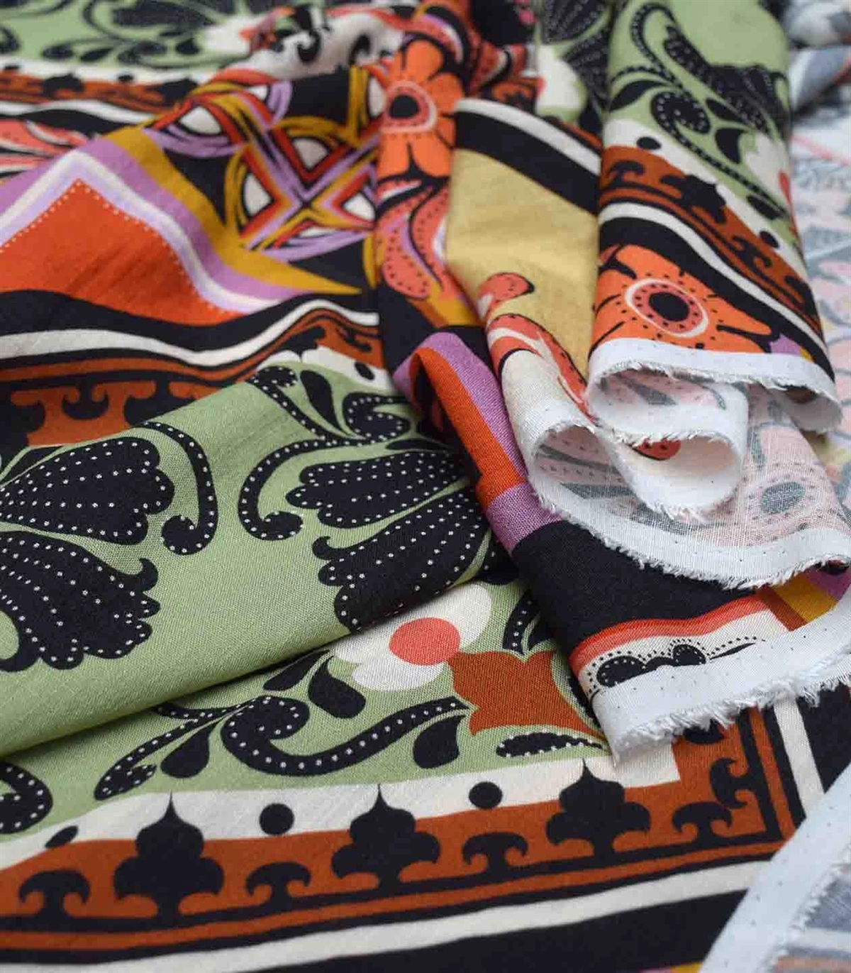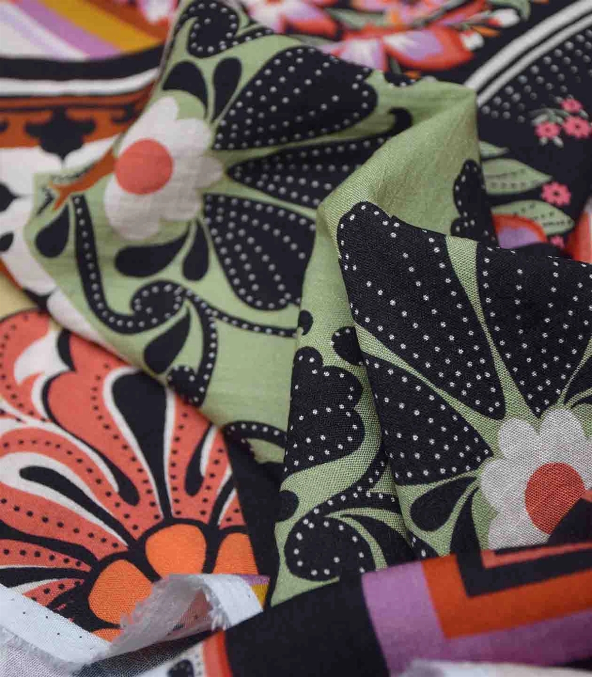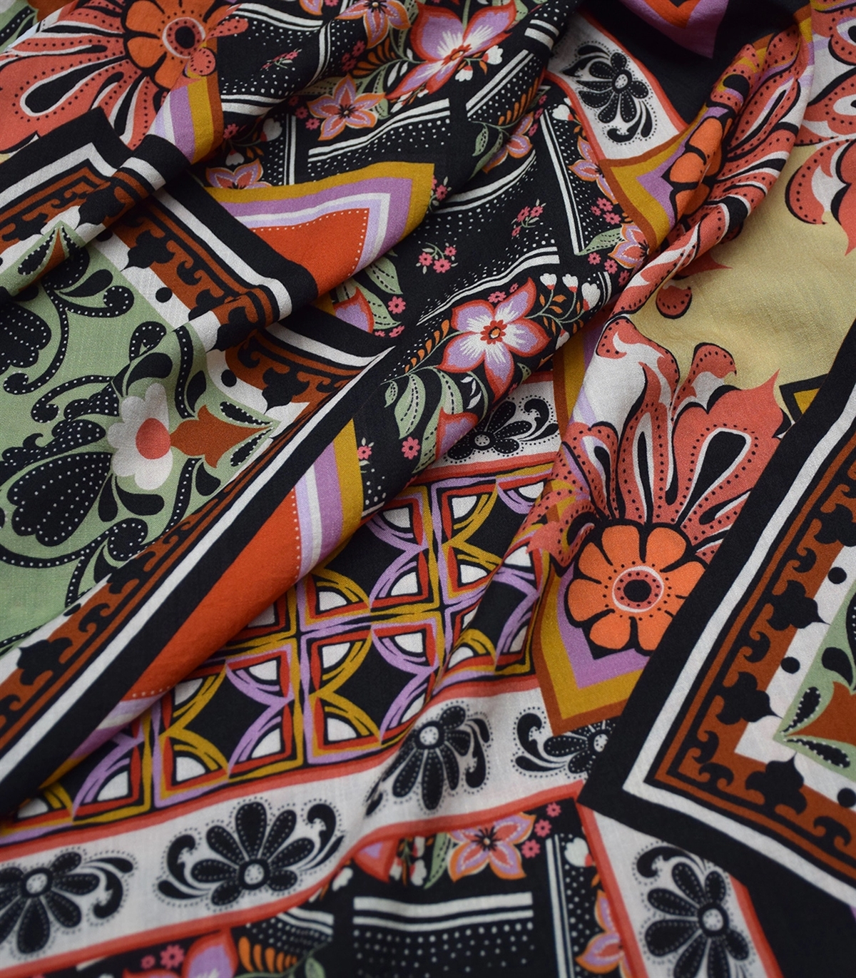 Crepevævet viskose med rustikke tern og blomstrede mønstre i varme nuancer. Kvaliteten er let og luftig.