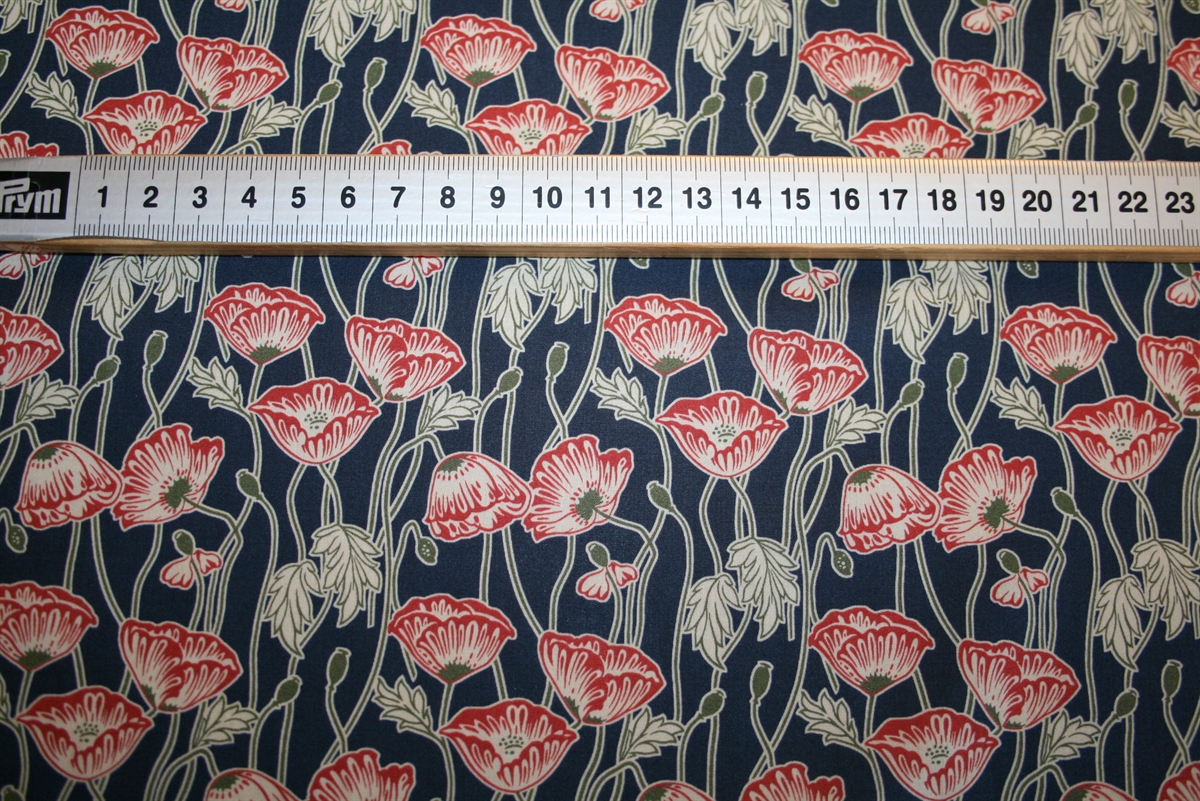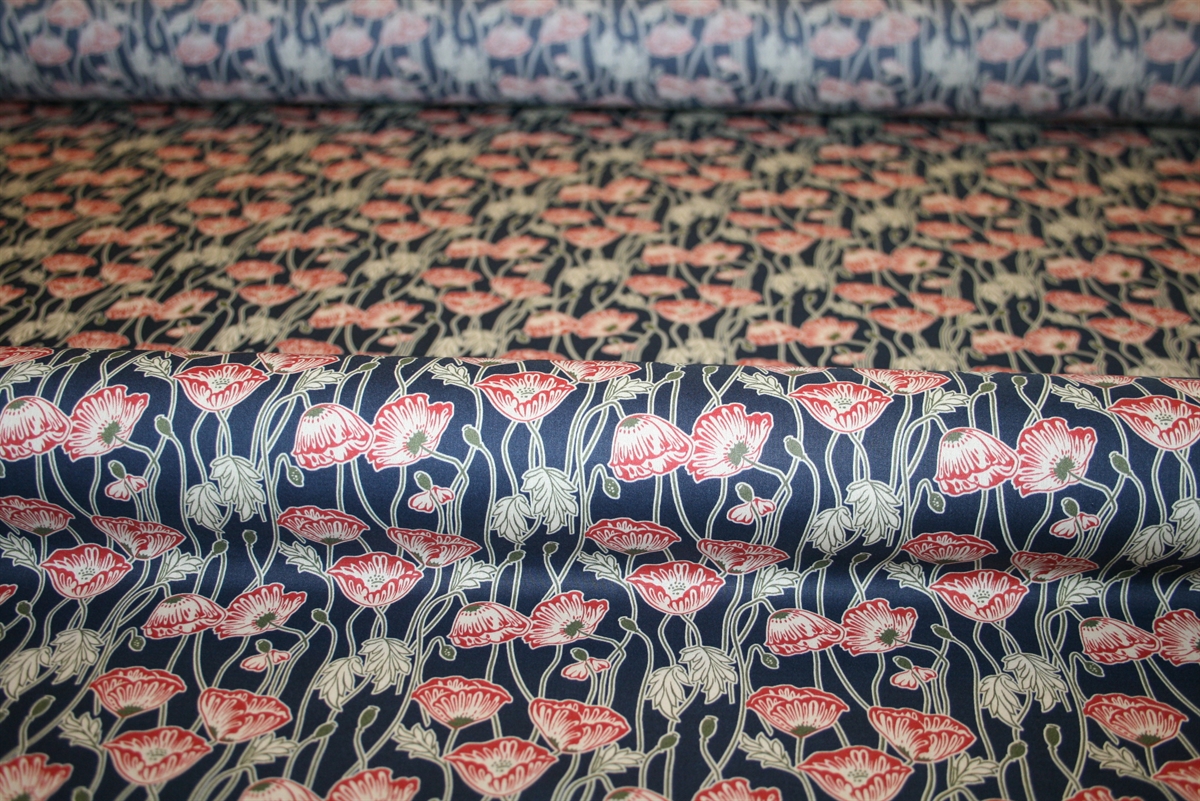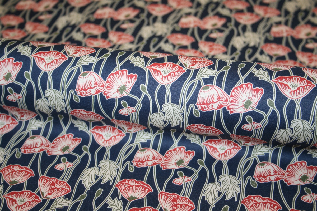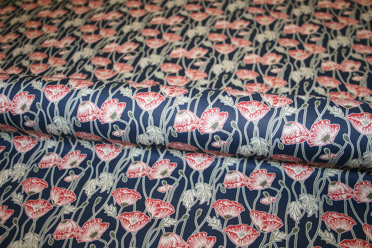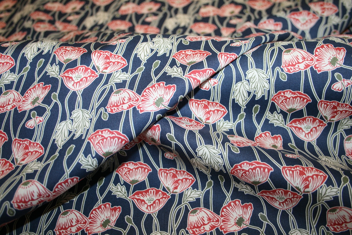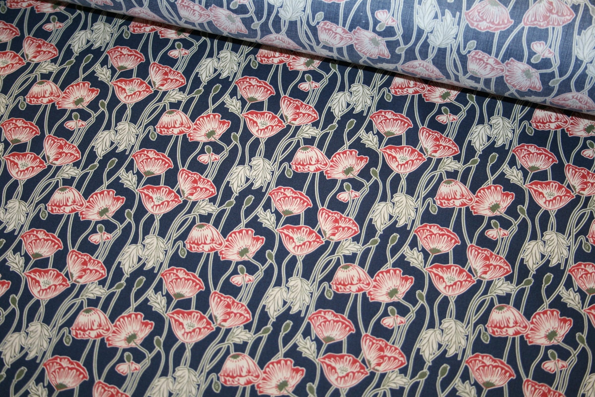 Liberty Tana Lawn™ i 100% bomuld med røde valmuer på en mørkeblå bund.