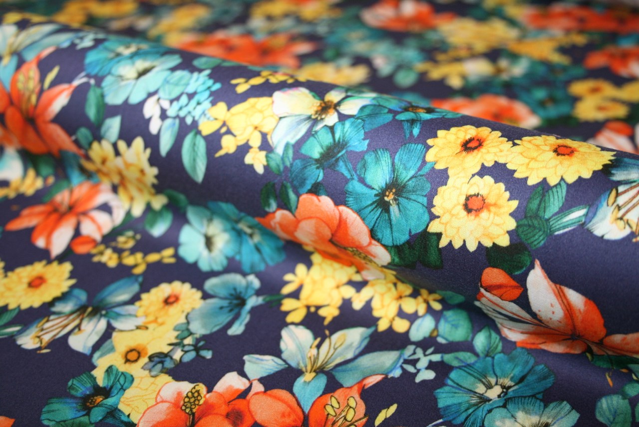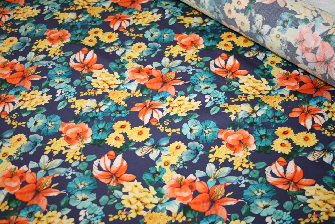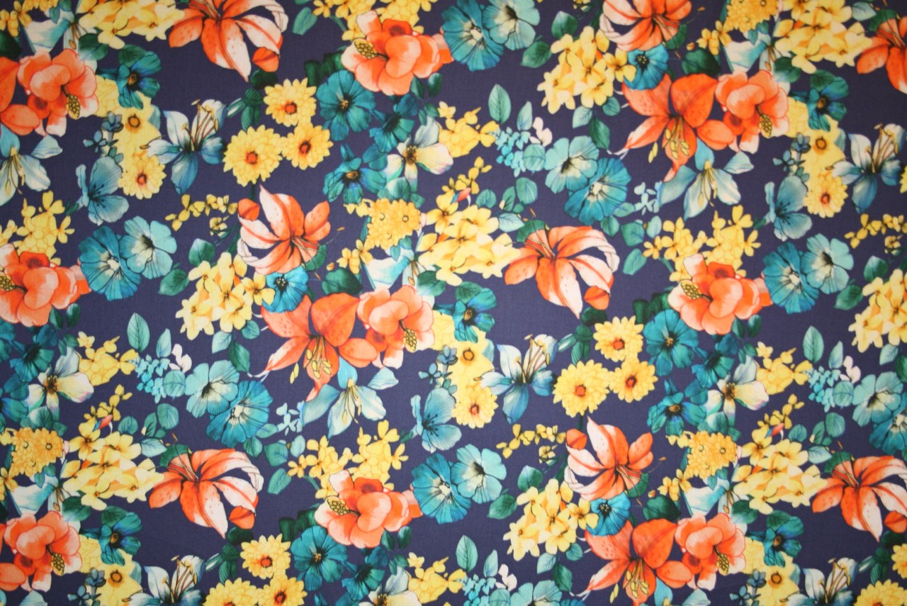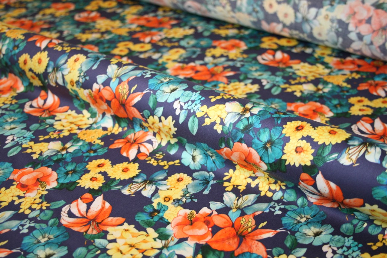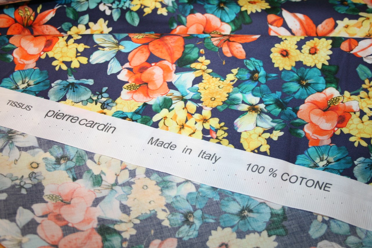 Smørblød bomuld med et smukt blomsterprint i klare farver designet af Pierre Cardin. Tæt og let vævning, der giver sig en smule på tværs.