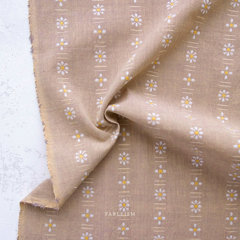 100% bomuld fra Fableism Supply Co. Stoffet er ivævet små fine tusindfryd blomster i lodrette baner. Kvaliteten er fastvævet og let-medium kraftig.