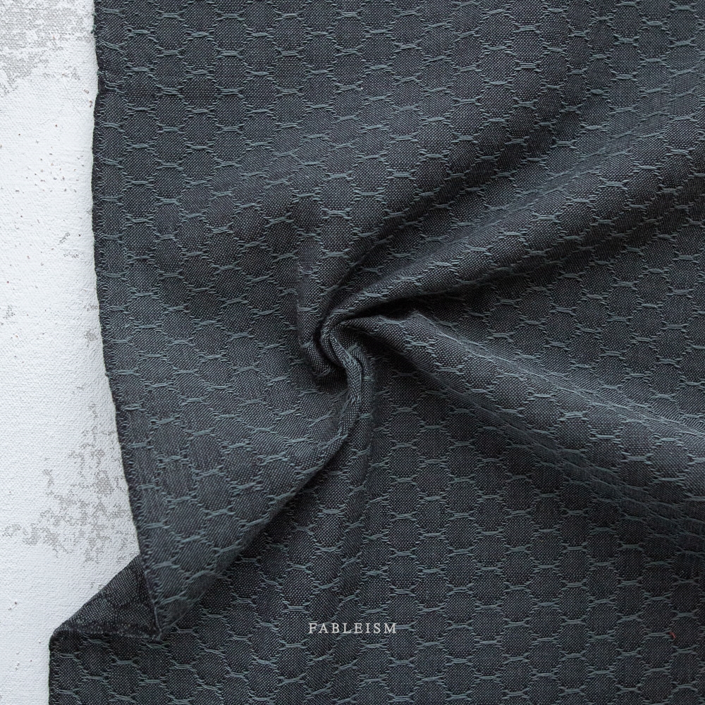 100% bomuld fra Fableism Supply Co. Stoffet er ivævet små bikuber. Kvaliteten er fastvævet og let-medium kraftig.