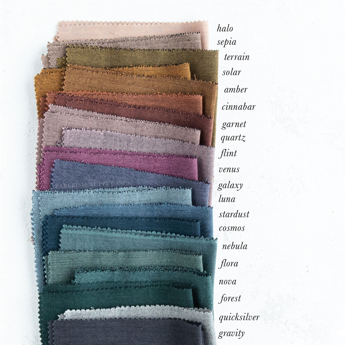 Fableism Supply Co er en familiedrevet virksomhed med en stærk passion for naturens afdæmpede farvepalette. Farver der aldrig går af mode, og som kan mikses på kryds og tværs ind i din hjemmesyede garderobe af tøj, patchwork og quilt. Alle metervarer er garnfarvet og der kan forekomme små variationer/uregelmæssigheder i farve, tekstur eller finish - dette kategoriseres ikke som fejl. Se nærmere på vores øvrige udvalg af metervarer fra Fableism her.