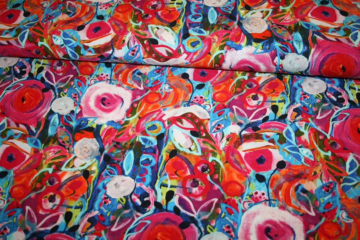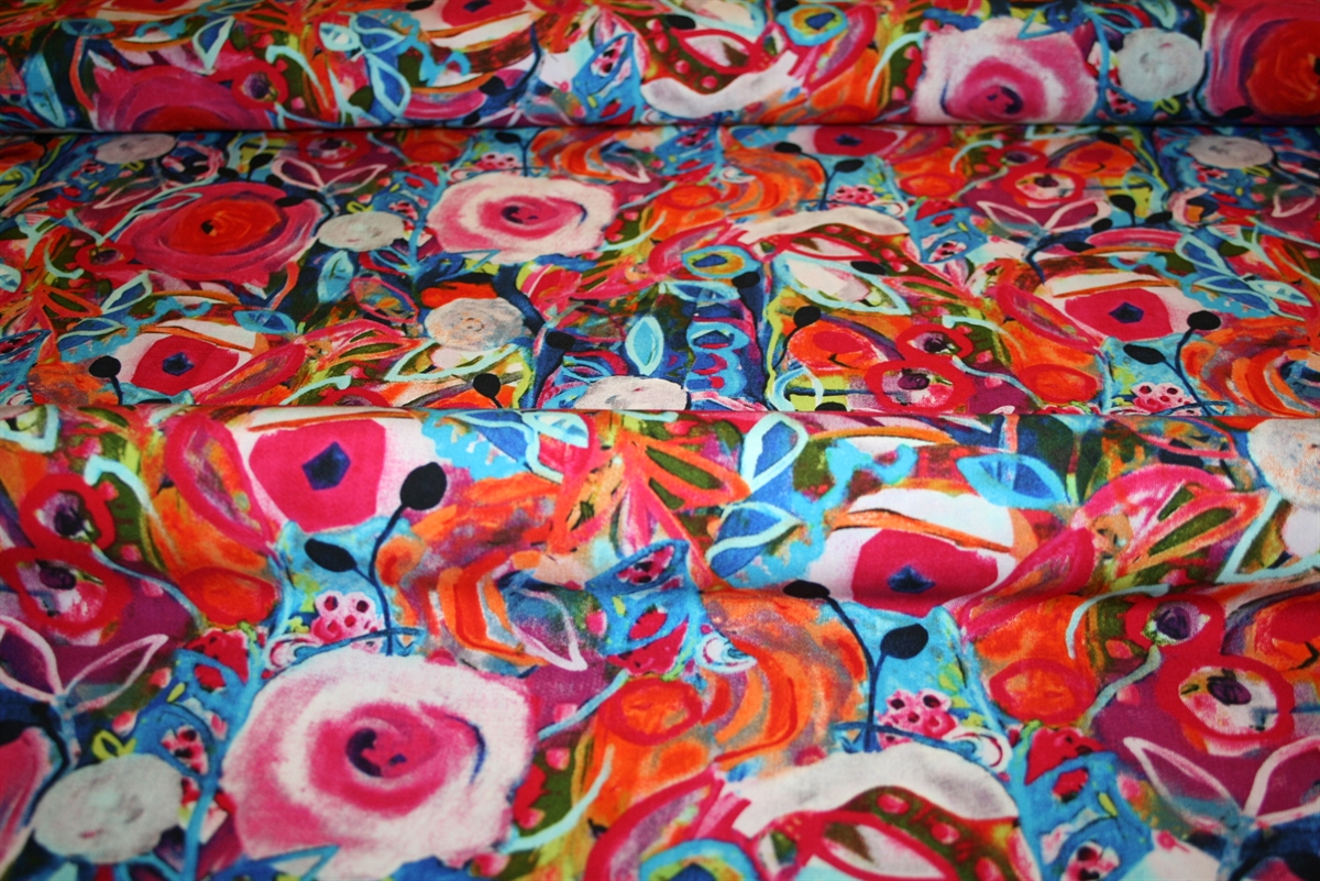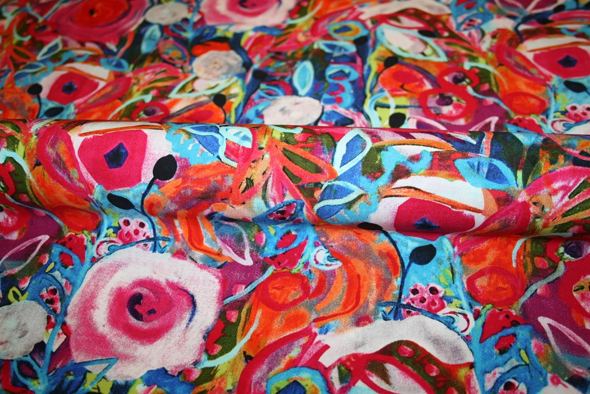 100% viskose med et farvestrålende print. En blød og lækker kvalitet, der er perfekt til luftige kjoler, tunika, løse bukser eller (flæse)nederdel.